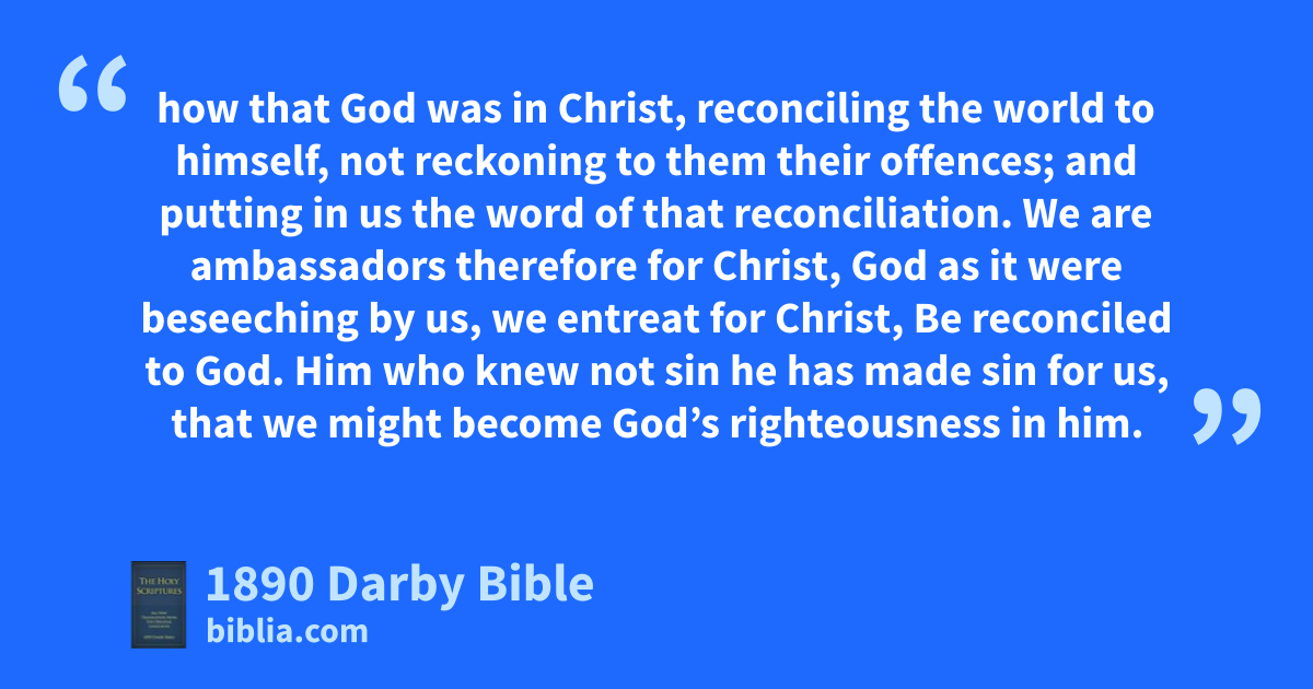 16 So that we henceforth know no one according to flesh; but if even we have known Christ according to flesh, yet now we know him thus no longer. 17 So if any one be in Christ, there is a new creation; the old things have passed away; behold all things have become new: 18 and all things are of the God who has reconciled us to himself by Jesus Christ, and given to us the ministry of that reconciliation: 19 how that God was in Christ, reconciling the world to himself, not reckoning to them their offences; and putting in us the word of that reconciliation. 20 We are ambassadors therefore for Christ, God as it were beseeching by us, we entreat for Christ, Be reconciled to God. 21 Him who knew not sin he has made sin for us, that we might become God’s righteousness in him.