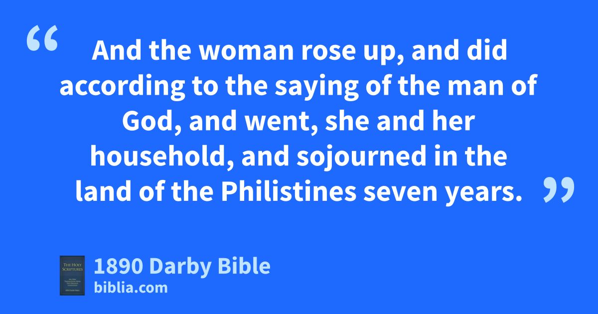 1 And Elisha had spoken to the woman whose son he had restored to life, saying, Rise up and go, thou and thy household, and sojourn wheresoever thou canst sojourn; for Jehovah has called for a famine, and it shall also come upon the land for seven years. 2 And the woman rose up, and did according to the saying of the man of God, and went, she and her household, and sojourned in the land of the Philistines seven years. 3 And it came to pass at the seven years’ end, that the woman returned out of the land of the Philistines; and she went forth to cry to the king for her house and for her land. 4 And the king was talking with Gehazi, the servant of the man of God, saying, Tell me, I pray thee, all the great things that Elisha has done. 5 And it came to pass as he was telling the king how he had restored a dead body to life, that behold, the woman whose son he had restored to life cried to the king for her house and for her land. And Gehazi said, My lord, O king, this is the woman, and this is her son, whom Elisha restored to life. 6 And the king asked the woman, and she told him. And the king appointed a certain chamberlain, saying, Restore all that was hers, and all the revenue of the land since the day that she left the country even until now.