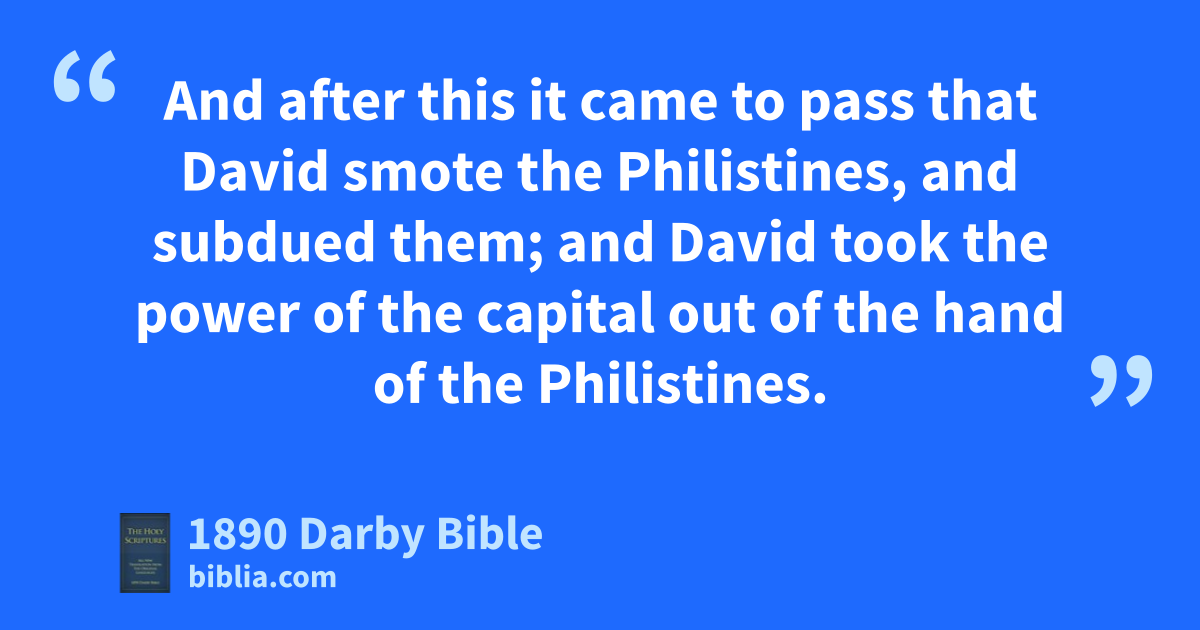 1 And after this it came to pass that David smote the Philistines, and subdued them; and David took the power of the capital out of the hand of the Philistines. 2 And he smote the Moabites, and measured them with a line, making them lie down on the ground; and he measured two lines to put to death, and one full line to keep alive. And the Moabites became David’s servants, and brought gifts. 3 And David smote Hadadezer, the son of Rehob, king of Zobah, as he went to recover his dominion by the river Euphrates. 4 And David took from him one thousand seven hundred horsemen, and twenty thousand footmen; and David houghed all the chariot horses, but reserved of them for a hundred chariots. 5 And the Syrians of Damascus came to help Hadadezer king of Zobah, and David smote of the Syrians twenty-two thousand men. 6 And David put garrisons in Syria of Damascus; and the Syrians became servants to David, and brought gifts. And Jehovah preserved David whithersoever he went. 7 And David took the shields of gold that were on the servants of Hadadezer, and brought them to Jerusalem. 8 And from Betah, and from Berothai, cities of Hadadezer, king David took exceeding much bronze.