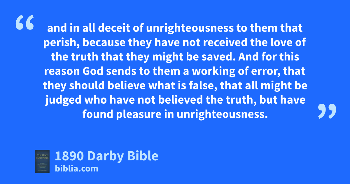 3 Let not any one deceive you in any manner, because it will not be unless the apostasy have first come, and the man of sin have been revealed, the son of perdition; 4 who opposes and exalts himself on high against all called God, or object of veneration; so that he himself sits down in the temple of God, shewing himself that he is God. 5 Do ye not remember that, being yet with you, I said these things to you? 6 And now ye know that which restrains, that he should be revealed in his own time. 7 For the mystery of lawlessness already works; only there is he who restrains now until he be gone, 8 and then the lawless one shall be revealed, whom the Lord Jesus shall consume with the breath of his mouth, and shall annul by the appearing of his coming; 9 whose coming is according to the working of Satan in all power and signs and wonders of falsehood, 10 and in all deceit of unrighteousness to them that perish, because they have not received the love of the truth that they might be saved. 11 And for this reason God sends to them a working of error, that they should believe what is false, 12 that all might be judged who have not believed the truth, but have found pleasure in unrighteousness.