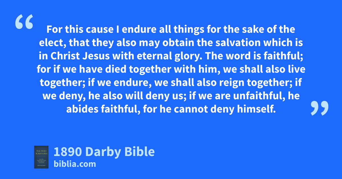 8 Remember Jesus Christ raised from among the dead, of the seed of David, according to my glad tidings, 9 in which I suffer even unto bonds as an evil-doer: but the word of God is not bound. 10 For this cause I endure all things for the sake of the elect, that they also may obtain the salvation which is in Christ Jesus with eternal glory. 11 The word is faithful; for if we have died together with him, we shall also live together; 12 if we endure, we shall also reign together; if we deny, he also will deny us; 13 if we are unfaithful, he abides faithful, for he cannot deny himself.