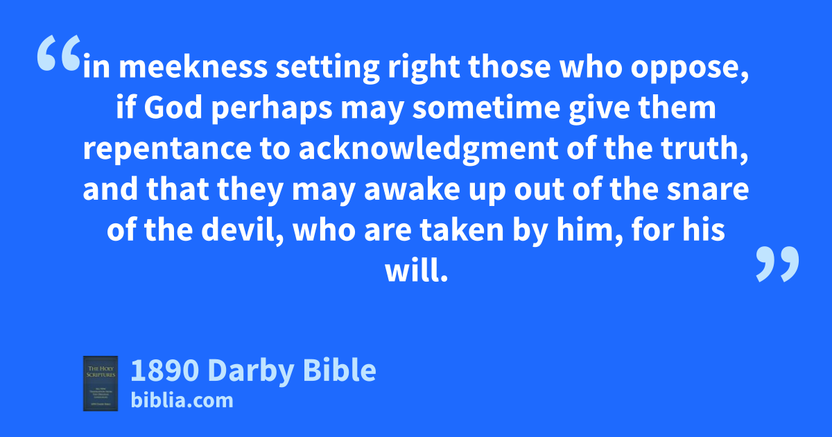 22 But youthful lusts flee, and pursue righteousness, faith, love, peace, with those that call upon the Lord out of a pure heart. 23 But foolish and senseless questionings avoid, knowing that they beget contentions. 24 And a bondman of the Lord ought not to contend, but be gentle towards all; apt to teach; forbearing; 25 in meekness setting right those who oppose, if God perhaps may sometime give them repentance to acknowledgment of the truth, 26 and that they may awake up out of the snare of the devil, who are taken by him, for his will.