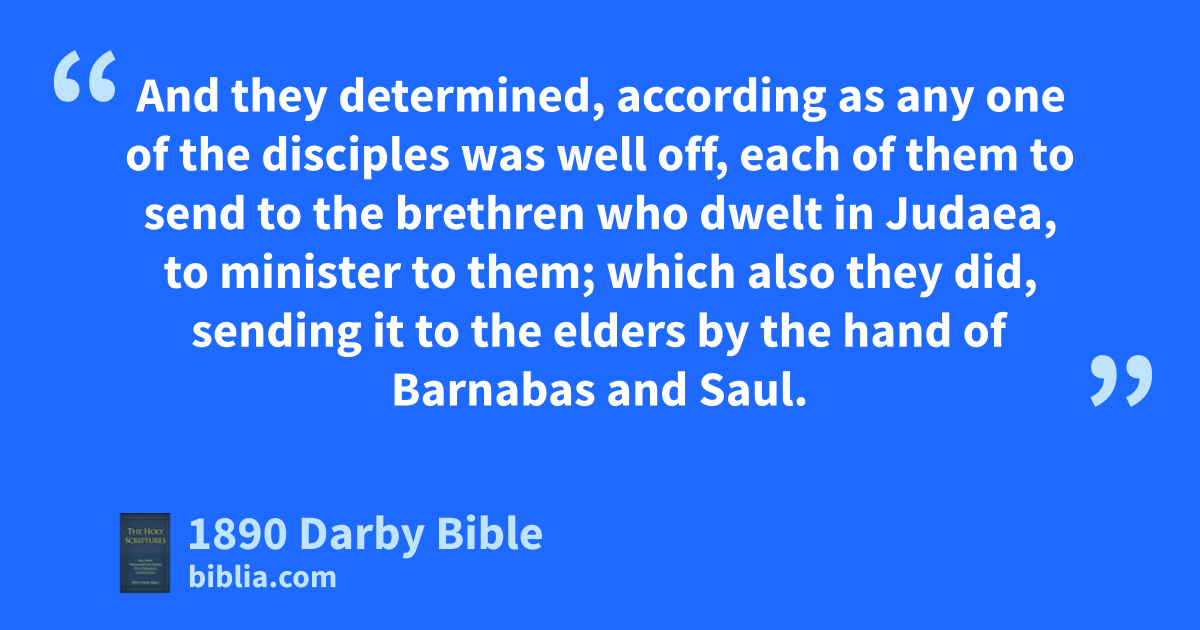 27 Now in these days prophets went down from Jerusalem to Antioch; 28 and one from among them, by name Agabus, rose up and signified by the Spirit that there was going to be a great famine over all the inhabited earth, which also came to pass under Claudius. 29 And they determined, according as any one of the disciples was well off, each of them to send to the brethren who dwelt in Judaea, to minister to them; 30 which also they did, sending it to the elders by the hand of Barnabas and Saul.