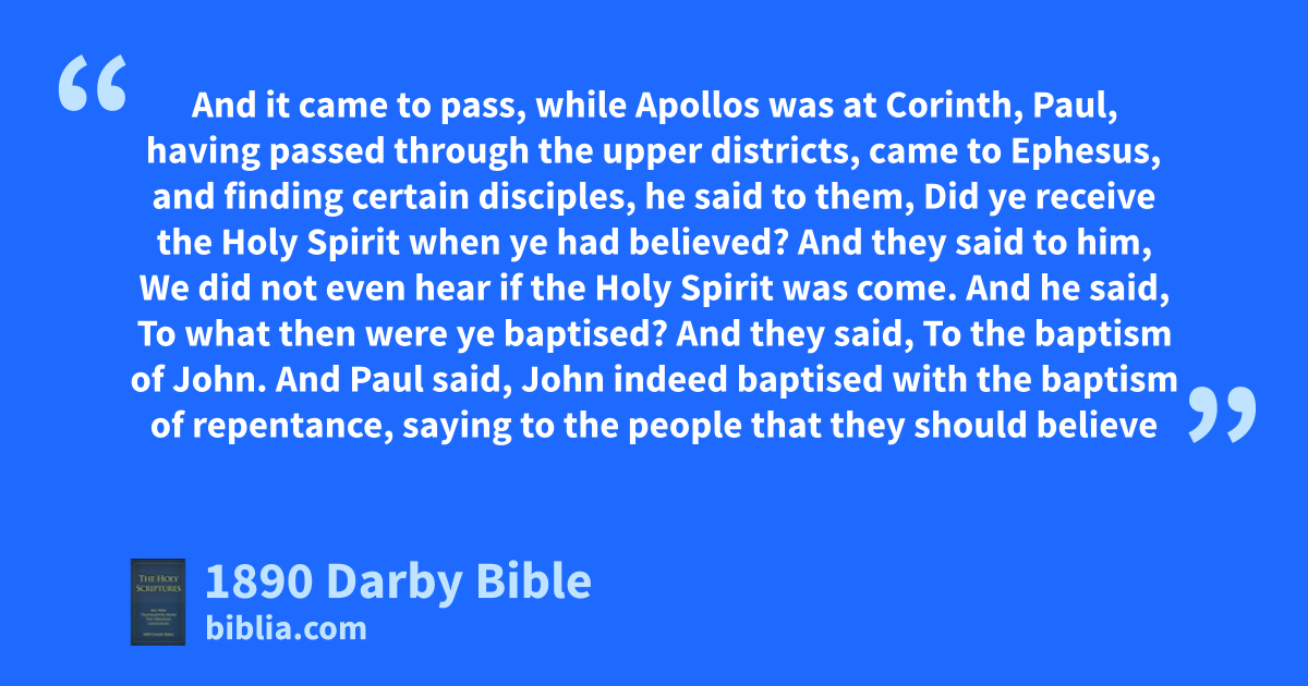 1 And it came to pass, while Apollos was at Corinth, Paul, having passed through the upper districts, came to Ephesus, and finding certain disciples, 2 he said to them, Did ye receive the Holy Spirit when ye had believed? And they said to him, We did not even hear if the Holy Spirit was come. 3 And he said, To what then were ye baptised? And they said, To the baptism of John. 4 And Paul said, John indeed baptised with the baptism of repentance, saying to the people that they should believe on him that was coming after him, that is, on Jesus. 5 And when they heard that, they were baptised to the name of the Lord Jesus. 6 And Paul having laid his hands on them, the Holy Spirit came upon them, and they spoke with tongues and prophesied. 7 And all the men were about twelve.