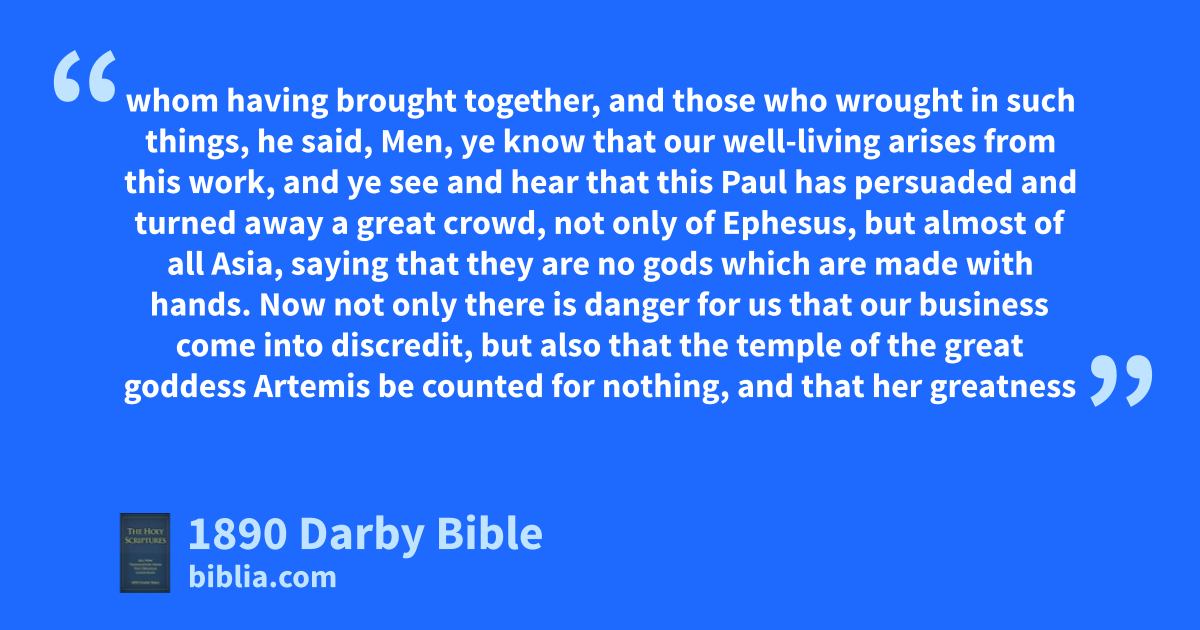 21 And when these things were fulfilled, Paul purposed in his spirit to go to Jerusalem, passing through Macedonia and Achaia, saying, After I have been there I must see Rome also. 22 And having sent into Macedonia two of those ministering to him, Timotheus and Erastus, he remained himself awhile in Asia. 23 And there took place at that time no small disturbance about the way. 24 For a certain man by name Demetrius, a silver-beater, making silver temples of Artemis, brought no small gain to the artisans; 25 whom having brought together, and those who wrought in such things, he said, Men, ye know that our well-living arises from this work, 26 and ye see and hear that this Paul has persuaded and turned away a great crowd, not only of Ephesus, but almost of all Asia, saying that they are no gods which are made with hands. 27 Now not only there is danger for us that our business come into discredit, but also that the temple of the great goddess Artemis be counted for nothing, and that her greatness should be destroyed whom the whole of Asia and the world reveres. 28 And having heard this, and being filled with rage, they cried out, saying, Great is Artemis of the Ephesians. 29 And the whole city was filled with confusion, and they rushed with one accord to the theatre, having seized and carried off with them Gaius and Aristarchus, Macedonians, fellow-travellers of Paul. 30 But Paul intending to go in to the people, the disciples suffered him not; 31 and some of the Asiarchs also, who were his friends, sent to him and urged him not to throw himself into the theatre. 32 Different persons therefore cried out some different thing; for the assembly was tumultuous, and the most did not know for what cause they had come together. 33 But from among the crowd they put forward Alexander, the Jews pushing him forward. And Alexander, beckoning with his hand, would have made a defence to the people. 34 But, recognising that he was a Jew, there was one cry from all, shouting for about two hours, Great is Artemis of the Ephesians. 35 And the townclerk, having quieted the crowd, said, Ephesians, what man is there then who does not know that the city of the Ephesians is temple-keeper of Artemis the great, and of the image which fell down from heaven? 36 These things therefore being undeniable, it is necessary that ye should be calm and do nothing headlong. 37 For ye have brought these men, who are neither temple-plunderers, nor speak injuriously of your goddess. 38 If therefore Demetrius and the artisans who are with him have a matter against any one, the courts are being held, and there are proconsuls: let them accuse one another. 39 But if ye inquire anything concerning other matters, it will be settled in the regular assembly. 40 For also we are in danger to be put in accusation for sedition for this affair of to-day, no cause existing in reference to which we shall be able to give a reason for this concourse. 41 And having said these things, he dismissed the assembly.
