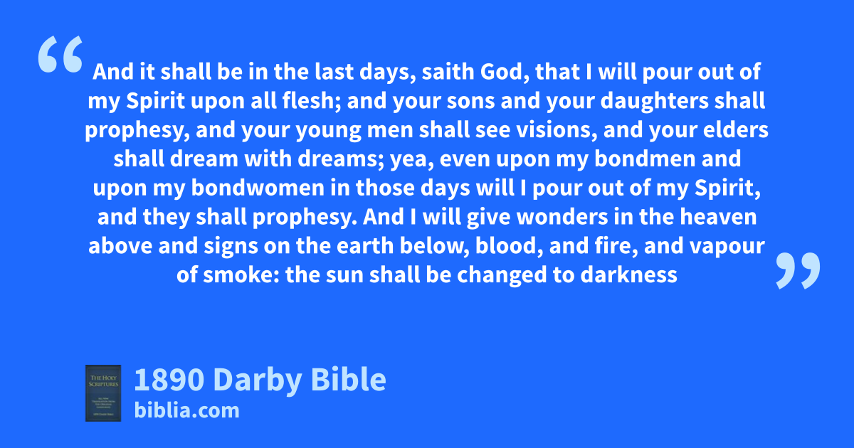 14 But Peter, standing up with the eleven, lifted up his voice and spoke forth to them, Men of Judaea, and all ye inhabitants of Jerusalem, let this be known to you, and give heed to my words: 15 for these are not full of wine, as ye suppose, for it is the third hour of the day; 16 but this is that which was spoken through the prophet Joel, 17 And it shall be in the last days, saith God, that I will pour out of my Spirit upon all flesh; and your sons and your daughters shall prophesy, and your young men shall see visions, and your elders shall dream with dreams; 18 yea, even upon my bondmen and upon my bondwomen in those days will I pour out of my Spirit, and they shall prophesy. 19 And I will give wonders in the heaven above and signs on the earth below, blood, and fire, and vapour of smoke: 20 the sun shall be changed to darkness and the moon to blood, before the great and gloriously appearing day of the Lord come. 21 And it shall be that whosoever shall call upon the name of the Lord shall be saved. 22 Men of Israel, hear these words: Jesus the Nazaraean, a man borne witness to by God to you by works of power and wonders and signs, which God wrought by him in your midst, as yourselves know 23 —him, given up by the determinate counsel and foreknowledge of God, ye, by the hand of lawless men, have crucified and slain. 24 Whom God has raised up, having loosed the pains of death, inasmuch as it was not possible that he should be held by its power; 25 for David says as to him, I foresaw the Lord continually before me, because he is at my right hand that I may not be moved. 26 Therefore has my heart rejoiced and my tongue exulted; yea more, my flesh also shall dwell in hope, 27 for thou wilt not leave my soul in hades, nor wilt thou give thy gracious one to see corruption. 28 Thou hast made known to me the paths of life, thou wilt fill me with joy with thy countenance. 29 Brethren, let it be allowed to speak with freedom to you concerning the patriarch David, that he has both died and been buried, and his monument is amongst us unto this day. 30 Being therefore a prophet, and knowing that God had sworn to him with an oath, of the fruit of his loins to set upon his throne; 31 he, seeing it before, spoke concerning the resurrection of the Christ, that neither has he been left in hades nor his flesh seen corruption. 32 This Jesus has God raised up, whereof all we are witnesses. 33 Having therefore been exalted by the right hand of God, and having received of the Father the promise of the Holy Spirit, he has poured out this which ye behold and hear. 34 For David has not ascended into the heavens, but he says himself, The Lord said unto my Lord, Sit at my right hand 35 until I have put thine enemies to be the footstool of thy feet. 36 Let the whole house of Israel therefore know assuredly that God has made him, this Jesus whom ye have crucified, both Lord and Christ.