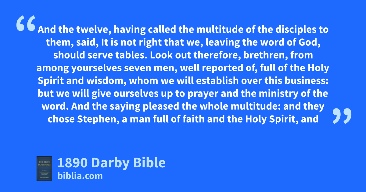 1 But in those days, the disciples multiplying in number, there arose a murmuring of the Hellenists against the Hebrews because their widows were overlooked in the daily ministration. 2 And the twelve, having called the multitude of the disciples to them, said, It is not right that we, leaving the word of God, should serve tables. 3 Look out therefore, brethren, from among yourselves seven men, well reported of, full of the Holy Spirit and wisdom, whom we will establish over this business: 4 but we will give ourselves up to prayer and the ministry of the word. 5 And the saying pleased the whole multitude: and they chose Stephen, a man full of faith and the Holy Spirit, and Philip, and Prochorus, and Nicanor, and Timon, and Parmenas, and Nicolas, a proselyte of Antioch, 6 whom they set before the apostles; and, having prayed, they laid their hands on them. 7 And the word of God increased; and the number of the disciples in Jerusalem was very greatly multiplied, and a great crowd of the priests obeyed the faith.