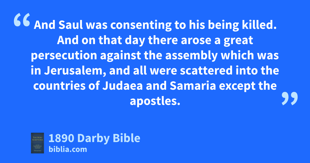 1 And Saul was consenting to his being killed. And on that day there arose a great persecution against the assembly which was in Jerusalem, and all were scattered into the countries of Judaea and Samaria except the apostles. 2 And pious men buried Stephen and made great lamentation over him. 3 But Saul ravaged the assembly, entering into the houses one after another, and dragging off both men and women delivered them up to prison.