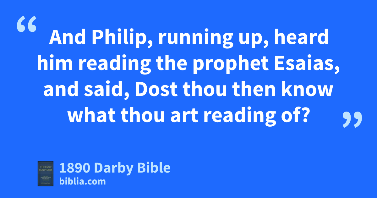 26 But the angel of the Lord spoke to Philip, saying, Rise up and go southward on the way which goes down from Jerusalem to Gaza: the same is desert. 27 And he rose up and went. And lo, an Ethiopian, a eunuch, a man in power under Candace queen of the Ethiopians, who was over all her treasure, who had come to worship at Jerusalem, 28 was returning and sitting in his chariot: and he was reading the prophet Esaias. 29 And the Spirit said to Philip, Approach and join this chariot. 30 And Philip, running up, heard him reading the prophet Esaias, and said, Dost thou then know what thou art reading of? 31 And he said, How should I then be able unless some one guide me? And he begged Philip to come up and sit with him. 32 And the passage of the scripture which he read was this: He was led as a sheep to slaughter, and as a lamb is dumb in presence of him that shears him, thus he opens not his mouth. 33 In his humiliation his judgment has been taken away, and who shall declare his generation? for his life is taken from the earth. 34 And the eunuch answering Philip said, I pray thee, concerning whom does the prophet say this? of himself or of some other? 35 And Philip, opening his mouth and beginning from that scripture, announced the glad tidings of Jesus to him. 36 And as they went along the way, they came upon a certain water, and the eunuch says, Behold water; what hinders my being baptised? 37 38 And he commanded the chariot to stop. And they went down both to the water, both Philip and the eunuch, and he baptised him. 39 But when they came up out of the water the Spirit of the Lord caught away Philip, and the eunuch saw him no longer, for he went on his way rejoicing. 40 And Philip was found at Azotus, and passing through he announced the glad tidings to all the cities till he came to Caesarea.