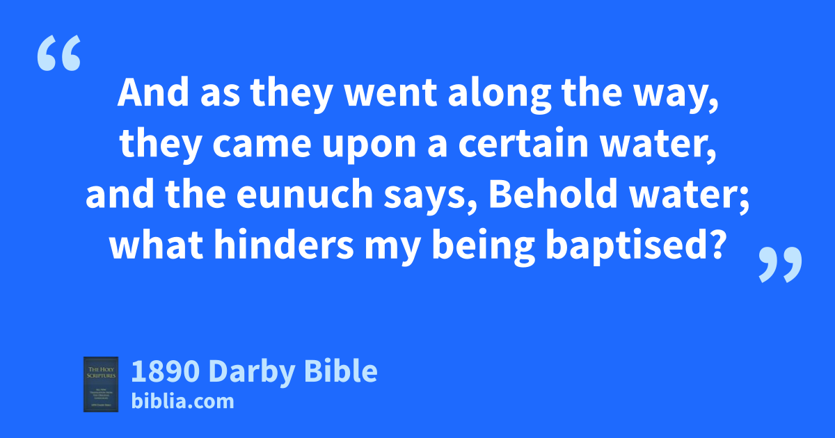 26 But the angel of the Lord spoke to Philip, saying, Rise up and go southward on the way which goes down from Jerusalem to Gaza: the same is desert. 27 And he rose up and went. And lo, an Ethiopian, a eunuch, a man in power under Candace queen of the Ethiopians, who was over all her treasure, who had come to worship at Jerusalem, 28 was returning and sitting in his chariot: and he was reading the prophet Esaias. 29 And the Spirit said to Philip, Approach and join this chariot. 30 And Philip, running up, heard him reading the prophet Esaias, and said, Dost thou then know what thou art reading of? 31 And he said, How should I then be able unless some one guide me? And he begged Philip to come up and sit with him. 32 And the passage of the scripture which he read was this: He was led as a sheep to slaughter, and as a lamb is dumb in presence of him that shears him, thus he opens not his mouth. 33 In his humiliation his judgment has been taken away, and who shall declare his generation? for his life is taken from the earth. 34 And the eunuch answering Philip said, I pray thee, concerning whom does the prophet say this? of himself or of some other? 35 And Philip, opening his mouth and beginning from that scripture, announced the glad tidings of Jesus to him. 36 And as they went along the way, they came upon a certain water, and the eunuch says, Behold water; what hinders my being baptised? 37 38 And he commanded the chariot to stop. And they went down both to the water, both Philip and the eunuch, and he baptised him. 39 But when they came up out of the water the Spirit of the Lord caught away Philip, and the eunuch saw him no longer, for he went on his way rejoicing. 40 And Philip was found at Azotus, and passing through he announced the glad tidings to all the cities till he came to Caesarea.