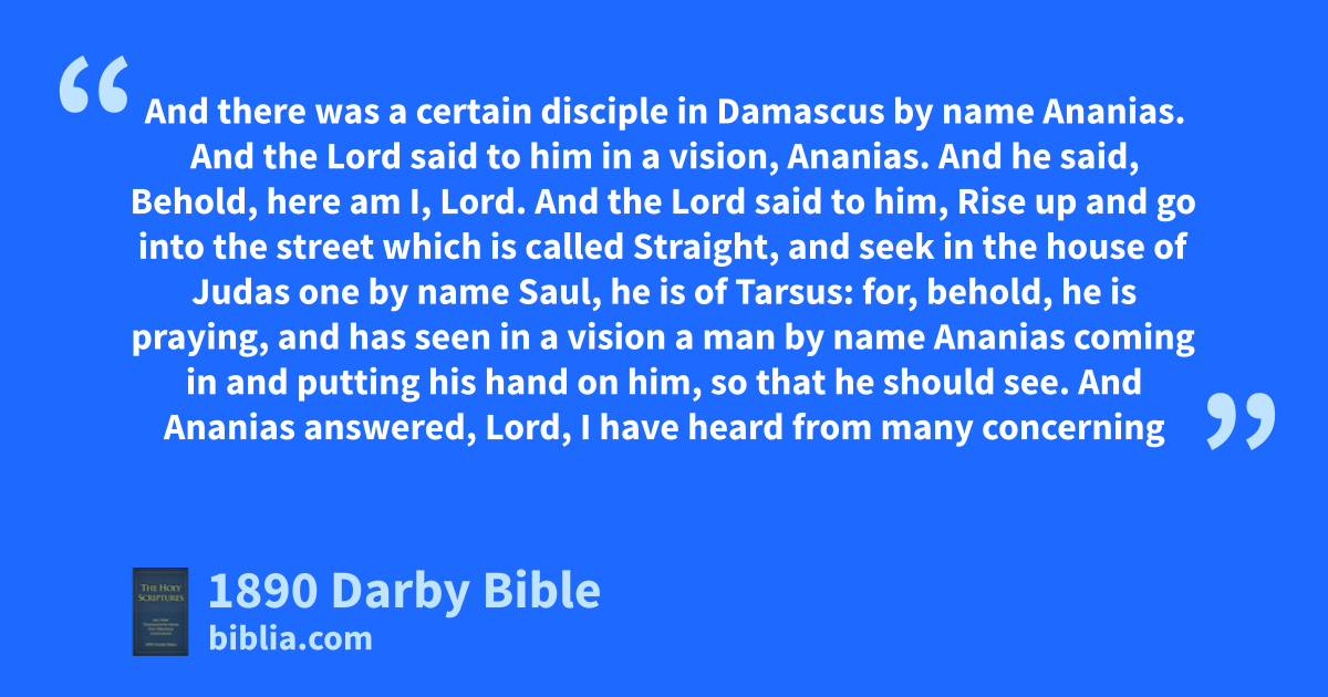 10 And there was a certain disciple in Damascus by name Ananias. And the Lord said to him in a vision, Ananias. And he said, Behold, here am I, Lord. 11 And the Lord said to him, Rise up and go into the street which is called Straight, and seek in the house of Judas one by name Saul, he is of Tarsus: for, behold, he is praying, 12 and has seen in a vision a man by name Ananias coming in and putting his hand on him, so that he should see. 13 And Ananias answered, Lord, I have heard from many concerning this man how much evil he has done to thy saints at Jerusalem; 14 and here he has authority from the chief priests to bind all who call upon thy name. 15 And the Lord said to him, Go, for this man is an elect vessel to me, to bear my name before both nations and kings and the sons of Israel: 16 for I will shew to him how much he must suffer for my name. 17 And Ananias went and entered into the house; and laying his hands upon him he said, Saul, brother, the Lord has sent me, Jesus that appeared to thee in the way in which thou camest, that thou mightest see, and be filled with the Holy Spirit. 18 And straightway there fell from his eyes as it were scales, and he saw, and rising up was baptised; 19 and, having received food, got strength. And he was with the disciples who were in Damascus certain days. 20 And straightway in the synagogues he preached Jesus that he is the Son of God. 21 And all who heard were astonished and said, Is not this he who destroyed in Jerusalem those who called on this name, and here was come for this purpose, that he might bring them bound to the chief priests? 22 But Saul increased the more in power, and confounded the Jews who dwelt in Damascus, proving that this is the Christ.