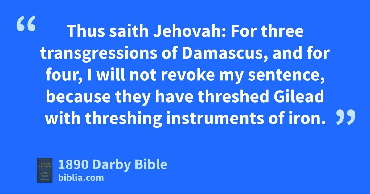 3 Thus saith Jehovah: For three transgressions of Damascus, and for four, I will not revoke my sentence, because they have threshed Gilead with threshing instruments of iron. 4 And I will send a fire into the house of Hazael, and it shall devour the palaces of Ben-Hadad. 5 And I will break the bar of Damascus, and cut off the inhabitant from the valley of Aven, and him that holdeth the sceptre from Beth-Eden; and the people of Syria shall go into captivity unto Kir, saith Jehovah. 6 Thus saith Jehovah: For three transgressions of Gazah, and for four, I will not revoke its sentence; because they carried away captive the whole captivity, to deliver them up to Edom. 7 And I will send a fire on the wall of Gazah, and it shall devour the palaces thereof. 8 And I will cut off the inhabitant from Ashdod, and him that holdeth the sceptre from Ashkelon, and I will turn my hand against Ekron; and the remnant of the Philistines shall perish, saith the Lord Jehovah. 9 Thus saith Jehovah: For three transgressions of Tyre, and for four, I will not revoke its sentence; because they delivered up the whole captivity to Edom, and remembered not the brotherly covenant. 10 And I will send a fire on the wall of Tyre, and it shall devour the palaces thereof. 11 Thus saith Jehovah: For three transgressions of Edom, and for four, I will not revoke its sentence; because he pursued his brother with the sword, and cast off all pity; and his anger did tear continually, and he kept his wrath for ever. 12 And I will send a fire upon Teman, and it shall devour the palaces of Bozrah. 13 Thus saith Jehovah: For three transgressions of the children of Ammon, and for four, I will not revoke its sentence; because they ripped up the women with child of Gilead, that they might enlarge their border. 14 And I will kindle a fire in the wall of Rabbah, and it shall devour the palaces thereof, with shouting in the day of battle, with a tempest in the day of the whirlwind. 15 And their king shall go into captivity, he and his princes together, saith Jehovah.
