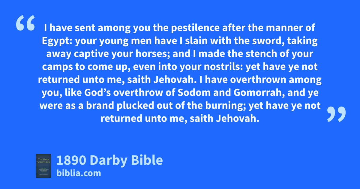 6 And I also have given you cleanness of teeth in all your cities, and want of bread in all your places; yet ye have not returned unto me, saith Jehovah. 7 And I also have withholden the rain from you, when there were yet three months to the harvest; and I caused it to rain upon one city, and caused it not to rain upon another city: one piece of land was rained upon, and the piece whereupon it rained not withered. 8 And two, three, cities wandered unto one city, to drink water, and were not satisfied: yet have ye not returned unto me, saith Jehovah. 9 I have smitten you with blasting and mildew; the palmer-worm hath devoured the multitude of your gardens, and your vineyards, and your fig-trees and your olive-trees: yet have ye not returned unto me, saith Jehovah. 10 I have sent among you the pestilence after the manner of Egypt: your young men have I slain with the sword, taking away captive your horses; and I made the stench of your camps to come up, even into your nostrils: yet have ye not returned unto me, saith Jehovah. 11 I have overthrown among you, like God’s overthrow of Sodom and Gomorrah, and ye were as a brand plucked out of the burning; yet have ye not returned unto me, saith Jehovah. 12 Therefore thus will I do unto thee, O Israel: because I will do this unto thee, prepare to meet thy God, O Israel. 13 For behold, he who formeth the mountains, and createth the wind, and declareth unto man what is his thought, who maketh the morning darkness, and treadeth upon the high places of the earth, —Jehovah, the God of hosts, is his name.