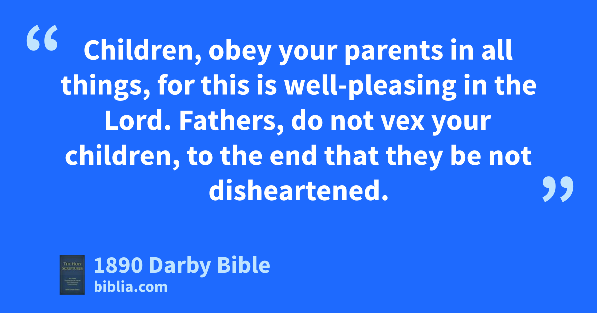 18 Wives, be subject to your husbands, as is fitting in the Lord. 19 Husbands, love your wives, and be not bitter against them. 20 Children, obey your parents in all things, for this is well-pleasing in the Lord. 21 Fathers, do not vex your children, to the end that they be not disheartened. 22 Bondmen, obey in all things your masters according to flesh; not with eye-services, as men-pleasers, but in simplicity of heart, fearing the Lord. 23 Whatsoever ye do, labour at it heartily, as doing it to the Lord, and not to men; 24 knowing that of the Lord ye shall receive the recompense of the inheritance; ye serve the Lord Christ. 25 For he that does a wrong shall receive the wrong he has done, and there is no respect of persons.