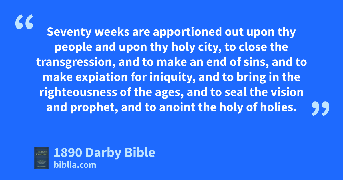 20 And whilst I was speaking, and praying, and confessing my sin and the sin of my people Israel, and presenting my supplication before Jehovah my God for the holy mountain of my God; 21 whilst I was yet speaking in prayer, the man Gabriel, whom I had seen in the vision at the beginning, flying swiftly, touched me about the time of the evening oblation. 22 And he informed me, and talked with me, and said, Daniel, I am now come forth to make thee skilful of understanding. 23 At the beginning of thy supplications the word went forth, and I am come to declare it; for thou art one greatly beloved. Therefore consider the word, and have understanding in the vision: 24 Seventy weeks are apportioned out upon thy people and upon thy holy city, to close the transgression, and to make an end of sins, and to make expiation for iniquity, and to bring in the righteousness of the ages, and to seal the vision and prophet, and to anoint the holy of holies. 25 Know therefore and understand: From the going forth of the word to restore and to build Jerusalem unto Messiah, the Prince, are seven weeks, and sixty-two weeks. The street and the moat shall be built again, even in troublous times. 26 And after the sixty-two weeks shall Messiah be cut off, and shall have nothing; and the people of the prince that shall come shall destroy the city and the sanctuary; and the end thereof shall be with an overflow, and unto the end, war, —the desolations determined. 27 And he shall confirm a covenant with the many for one week; and in the midst of the week he shall cause the sacrifice and the oblation to cease, and because of the protection of abominations there shall be a desolator, even until that the consumption and what is determined shall be poured out upon the desolate.