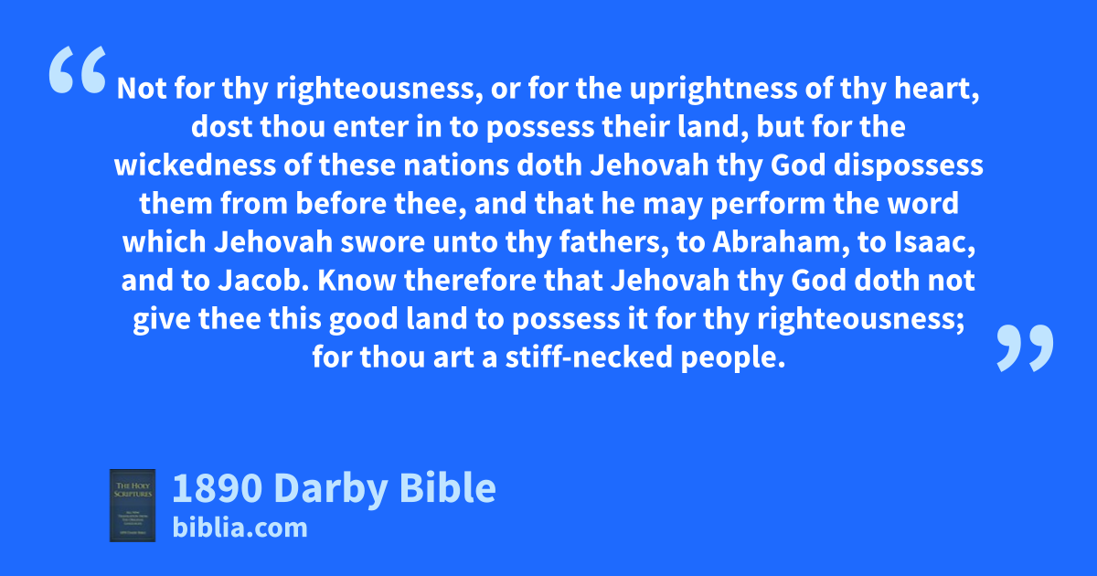1 Hear, Israel! Thou art to pass over the Jordan this day, to enter in to possess nations greater and mightier than thou, cities great and walled up to heaven, 2 a people great and tall, the sons of the Anakim, whom thou knowest, and of whom thou hast heard say, Who can stand before the sons of Anak! 3 Know then this day, that Jehovah thy God is he that goeth over before thee, a consuming fire; he will destroy them, and he will cast them down before thee, and thou shalt dispossess them and cause them to perish quickly, as Jehovah hath said unto thee. 4 Thou shalt not say in thy heart, when Jehovah thy God thrusteth them out from before thee, saying, For my righteousness Jehovah hath brought me in to possess this land; but for the wickedness of these nations doth Jehovah dispossess them from before thee. 5 Not for thy righteousness, or for the uprightness of thy heart, dost thou enter in to possess their land, but for the wickedness of these nations doth Jehovah thy God dispossess them from before thee, and that he may perform the word which Jehovah swore unto thy fathers, to Abraham, to Isaac, and to Jacob. 6 Know therefore that Jehovah thy God doth not give thee this good land to possess it for thy righteousness; for thou art a stiff-necked people.