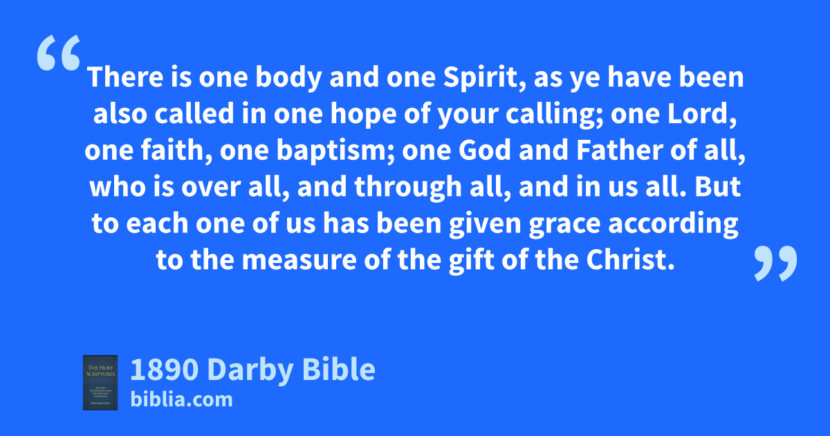 2 with all lowliness and meekness, with long-suffering, bearing with one another in love; 3 using diligence to keep the unity of the Spirit in the uniting bond of peace. 4 There is one body and one Spirit, as ye have been also called in one hope of your calling; 5 one Lord, one faith, one baptism; 6 one God and Father of all, who is over all, and through all, and in us all. 7 But to each one of us has been given grace according to the measure of the gift of the Christ. 8 Wherefore he says, Having ascended up on high, he has led captivity captive, and has given gifts to men. 9 But that he ascended, what is it but that he also descended into the lower parts of the earth? 10 He that descended is the same who has also ascended up above all the heavens, that he might fill all things; 11 and he has given some apostles, and some prophets, and some evangelists, and some shepherds and teachers, 12 for the perfecting of the saints; with a view to the work of the ministry, with a view to the edifying of the body of Christ; 13 until we all arrive at the unity of the faith and of the knowledge of the Son of God, at the full-grown man, at the measure of the stature of the fulness of the Christ; 14 in order that we may be no longer babes, tossed and carried about by every wind of that teaching which is in the sleight of men, in unprincipled cunning with a view to systematized error; 15 but, holding the truth in love, we may grow up to him in all things, who is the head, the Christ: 16 from whom the whole body, fitted together, and connected by every joint of supply, according to the working in its measure of each one part, works for itself the increase of the body to its self-building up in love.