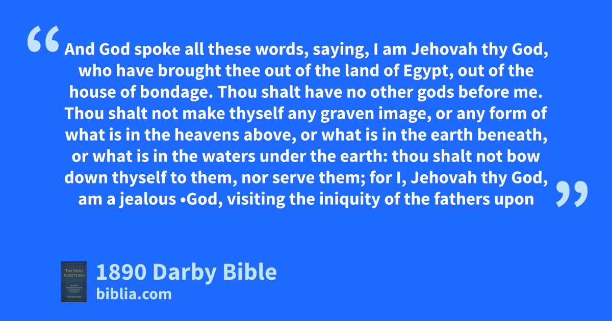 1 And God spoke all these words, saying, 2 I am Jehovah thy God, who have brought thee out of the land of Egypt, out of the house of bondage. 3 Thou shalt have no other gods before me. 4 Thou shalt not make thyself any graven image, or any form of what is in the heavens above, or what is in the earth beneath, or what is in the waters under the earth: 5 thou shalt not bow down thyself to them, nor serve them; for I, Jehovah thy God, am a jealous •God, visiting the iniquity of the fathers upon the sons to the third and to the fourth generation of them that hate me, 6 and shewing mercy unto thousands of them that love me and keep my commandments. 7 Thou shalt not idly utter the name of Jehovah thy God; for Jehovah will not hold him guiltless that idly uttereth his name. 8 Remember the sabbath day to hallow it. 9 Six days shalt thou labour, and do all thy work; 10 but the seventh day is the sabbath of Jehovah thy God: thou shalt not do any work, thou, nor thy son, nor thy daughter, thy bondman, nor thy handmaid, nor thy cattle, nor thy stranger that is within thy gates. 11 For in six days Jehovah made the heavens and the earth, the sea, and all that is in them, and rested on the seventh day; therefore Jehovah blessed the sabbath day, and hallowed it.