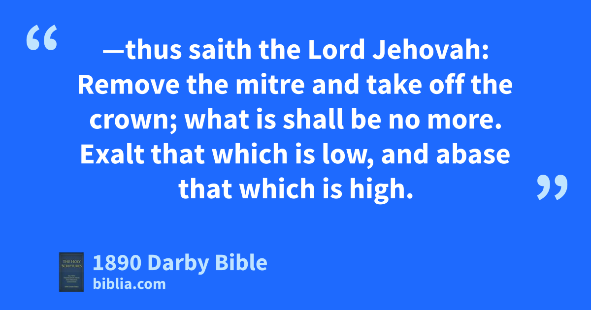 18 And the word of Jehovah came unto me, saying, 19 And thou, son of man, set thee two ways, by which the sword of the king of Babylon may come—out of one land shall they both come—and make thee a signpost, make it at the head of the way to the city. 20 Appoint a way for the coming of the sword to Rabbah of the children of Ammon, and to Judah at the fenced city of Jerusalem. 21 For the king of Babylon standeth at the parting of the way, at the head of the two ways, to use divination: he shaketh his arrows, he inquireth of the teraphim, he looketh in the liver. 22 In his right hand is the lot of Jerusalem to appoint battering-rams, to open the mouth for bloodshed, to lift up the voice with shouting, to appoint battering-rams against the gates, to cast mounds, to build siege-towers. 23 And this shall be a false divination in their sight, for them that have sworn oaths; but he will call to remembrance the iniquity, that they may be taken. 24 Therefore thus saith the Lord Jehovah: Because ye make your iniquity to be remembered in that your transgressions are discovered, so that in all your doings your sins appear; because ye are come to remembrance, ye shall be taken with the hand. 25 And thou, profane, wicked prince of Israel, whose day is come, at the time of the iniquity of the end, 26 —thus saith the Lord Jehovah: Remove the mitre and take off the crown; what is shall be no more. Exalt that which is low, and abase that which is high. 27 I will overturn, overturn, overturn it! This also shall be no more, until he come whose right it is; and I will give it to him.