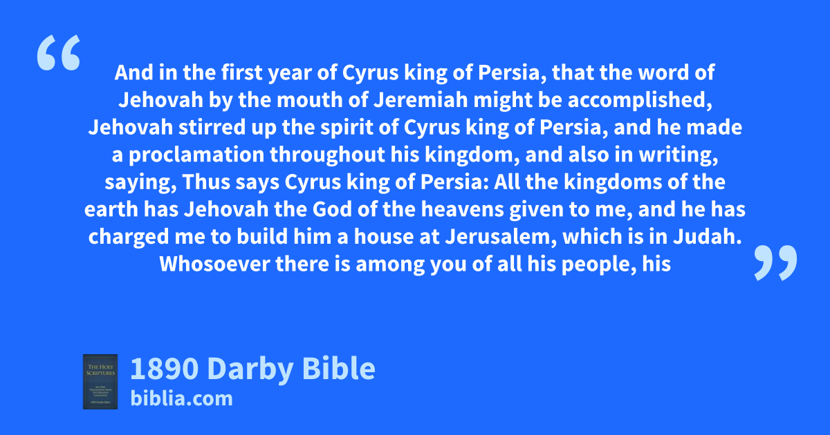 1 And in the first year of Cyrus king of Persia, that the word of Jehovah by the mouth of Jeremiah might be accomplished, Jehovah stirred up the spirit of Cyrus king of Persia, and he made a proclamation throughout his kingdom, and also in writing, saying, 2 Thus says Cyrus king of Persia: All the kingdoms of the earth has Jehovah the God of the heavens given to me, and he has charged me to build him a house at Jerusalem, which is in Judah. 3 Whosoever there is among you of all his people, his God be with him, and let him go up to Jerusalem, which is in Judah, and build the house of Jehovah the God of Israel—he is God—which is at Jerusalem. 4 And whosoever remains in any place where he sojourns, let the men of his place help him with silver, and with gold, and with goods, and with beasts, besides the voluntary offering for the house of God which is at Jerusalem.