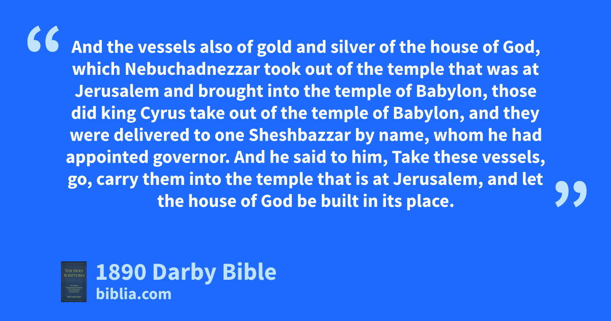 3 At that time came to them Tatnai, governor on this side the river, and Shethar-boznai, and their companions, and said thus to them: Who gave you orders to build this house and to complete this wall? 4 And they said to them after this manner: What are the names of the men that build this building? 5 But the eye of their God was upon the elders of the Jews, and they did not make them cease till the matter came to Darius; and then they returned answer by letter concerning it. 6 The copy of the letter that Tatnai, governor on this side the river, and Shethar-boznai, and his companions the Apharsachites, who were on this side the river, sent to Darius the king. 7 They sent a report to him in which was written thus: To Darius the king, all peace! 8 Be it known to the king that we went into the province of Judah, to the house of the great God, which is being built with great stones, and timber is laid in the walls, and this work is being carried on with diligence, and prospers in their hand. 9 Then asked we those elders: thus we said to them, Who gave you orders to build this house and to complete this wall? 10 We asked their names also, to inform thee, that we might write the names of the men that were the chief of them. 11 And thus they returned us answer, saying, We are the servants of the God of the heavens and the earth, and build the house that was built these many years ago; and a great king of Israel built and completed it. 12 But after that our fathers had provoked the God of the heavens to wrath, he gave them into the hand of Nebuchadnezzar king of Babylon, the Chaldean, and he destroyed this house, and carried the people away unto Babylon. 13 But in the first year of Cyrus king of Babylon, king Cyrus gave orders to build this house of God. 14 And the vessels also of gold and silver of the house of God, which Nebuchadnezzar took out of the temple that was at Jerusalem and brought into the temple of Babylon, those did king Cyrus take out of the temple of Babylon, and they were delivered to one Sheshbazzar by name, whom he had appointed governor. 15 And he said to him, Take these vessels, go, carry them into the temple that is at Jerusalem, and let the house of God be built in its place. 16 Then came the same Sheshbazzar, and laid the foundation of the house of God which is at Jerusalem; and since that time even until now has it been in building, and it is not completed. 17 And now, if it seem good to the king, let search be made in the king’s treasure-house, which is there at Babylon, whether it be so, that orders were given by king Cyrus to build this house of God at Jerusalem; and let the king send his pleasure to us concerning this matter.