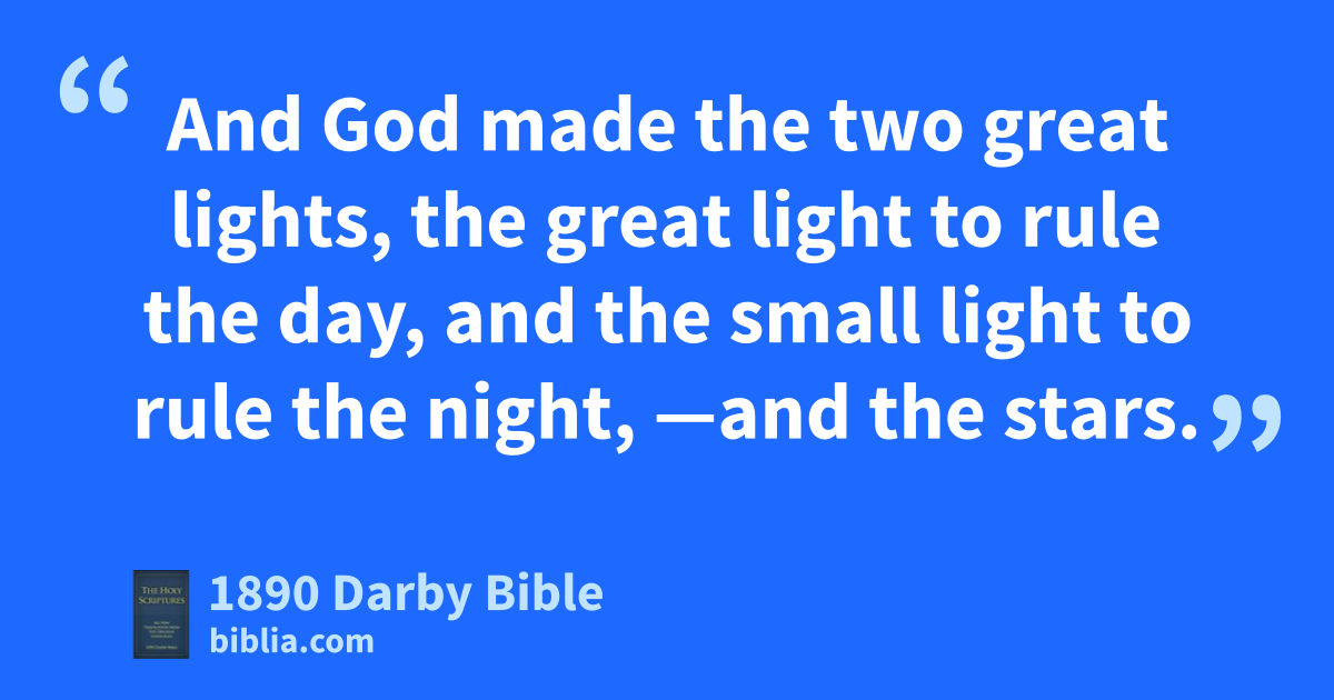 14 And God said, Let there be lights in the expanse of the heavens, to divide between the day and the night; and let them be for signs, and for seasons, and for days and years; 15 and let them be for lights in the expanse of the heavens, to give light on the earth. And it was so. 16 And God made the two great lights, the great light to rule the day, and the small light to rule the night, —and the stars. 17 And God set them in the expanse of the heavens, to give light on the earth, 18 and to rule during the day and during the night, and to divide between the light and the darkness. And God saw that it was good. 19 And there was evening, and there was morning—a fourth day.