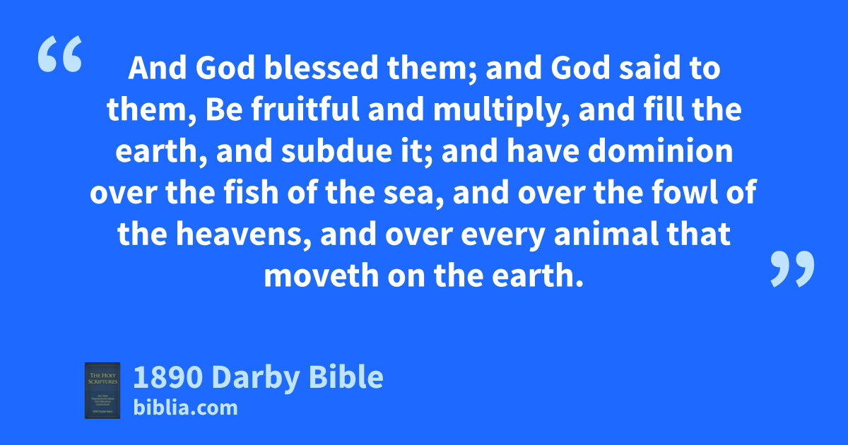 26 And God said, Let us make man in our image, after our likeness; and let them have dominion over the fish of the sea, and over the fowl of the heavens, and over the cattle, and over the whole earth, and over every creeping thing that creepeth on the earth. 27 And God created Man in his image, in the image of God created he him; male and female created he them. 28 And God blessed them; and God said to them, Be fruitful and multiply, and fill the earth, and subdue it; and have dominion over the fish of the sea, and over the fowl of the heavens, and over every animal that moveth on the earth.
