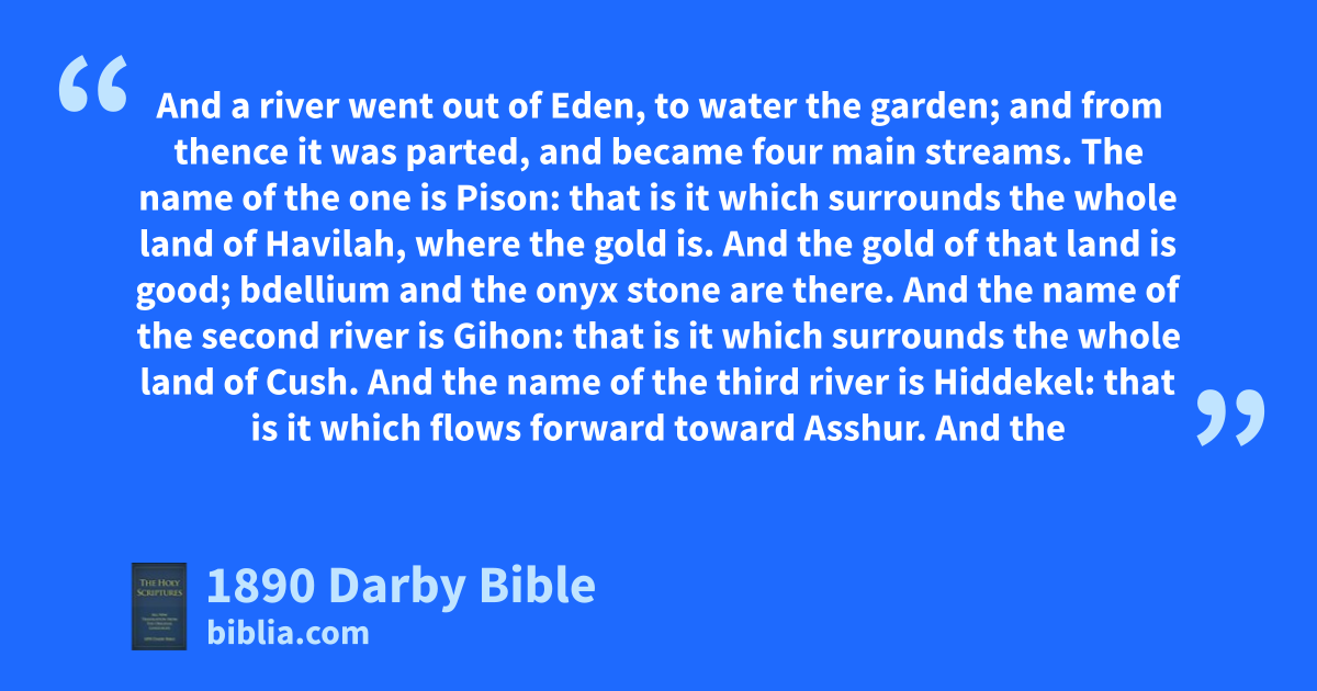 8 And Jehovah Elohim planted a garden in Eden eastward, and there put Man whom he had formed. 9 And out of the ground Jehovah Elohim made every tree grow that is pleasant to the sight, and good for food; and the tree of life, in the midst of the garden, and the tree of the knowledge of good and evil. 10 And a river went out of Eden, to water the garden; and from thence it was parted, and became four main streams. 11 The name of the one is Pison: that is it which surrounds the whole land of Havilah, where the gold is. 12 And the gold of that land is good; bdellium and the onyx stone are there. 13 And the name of the second river is Gihon: that is it which surrounds the whole land of Cush. 14 And the name of the third river is Hiddekel: that is it which flows forward toward Asshur. And the fourth river, that is Euphrates. 15 And Jehovah Elohim took Man, and put him into the garden of Eden, to till it and to guard it.