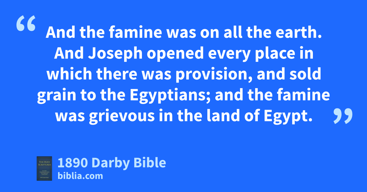 46 And Joseph was thirty years old when he stood before Pharaoh king of Egypt. And Joseph went out from Pharaoh, and passed through the whole land of Egypt. 47 And in the seven years of plenty the land brought forth by handfuls. 48 And he gathered up all the food of the seven years that was in the land of Egypt, and put the food in the cities; the food of the fields of the city, which were round about it, he laid up in it. 49 And Joseph laid up corn as sand of the sea exceeding much, until they left off numbering; for it was without number. 50 And to Joseph were born two sons before the year of famine came, whom Asnath the daughter of Potipherah the priest in On bore to him. 51 And Joseph called the name of the firstborn Manasseh—For God has made me forget all my toil, and all my father’s house. 52 And the name of the second he called Ephraim—For God has caused me to be fruitful in the land of my affliction. 53 And the seven years of plenty that were in the land of Egypt were ended; 54 and the seven years of the dearth began to come, according as Joseph had said. And there was dearth in all lands; but in all the land of Egypt there was bread. 55 And all the land of Egypt suffered from the dearth. And the people cried to Pharaoh for bread; and Pharaoh said to all the Egyptians, Go to Joseph: what he says to you, that do. 56 And the famine was on all the earth. And Joseph opened every place in which there was provision, and sold grain to the Egyptians; and the famine was grievous in the land of Egypt. 57 And all countries came into Egypt to Joseph, to buy grain, because the famine was grievous on the whole earth.