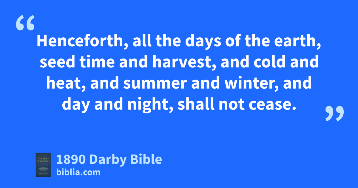 20 And Noah built an altar to Jehovah; and took of every clean animal, and of all clean fowl, and offered up burnt-offerings on the altar. 21 And Jehovah smelled the sweet odour. And Jehovah said in his heart, I will no more henceforth curse the ground on account of Man, for the thought of Man’s heart is evil from his youth; and I will no more smite every living thing, as I have done. 22 Henceforth, all the days of the earth, seed time and harvest, and cold and heat, and summer and winter, and day and night, shall not cease.
