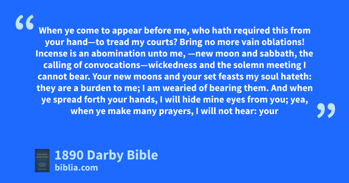 10 Hear the word of Jehovah, rulers of Sodom; give ear unto the law of our God, people of Gomorrah! 11 To what purpose is the multitude of your sacrifices unto me? saith Jehovah. I am sated with burnt-offerings of rams, and the fat of fed beasts; and in the blood of bullocks, and of lambs, and of he-goats I take no pleasure. 12 When ye come to appear before me, who hath required this from your hand—to tread my courts? 13 Bring no more vain oblations! Incense is an abomination unto me, —new moon and sabbath, the calling of convocations—wickedness and the solemn meeting I cannot bear. 14 Your new moons and your set feasts my soul hateth: they are a burden to me; I am wearied of bearing them. 15 And when ye spread forth your hands, I will hide mine eyes from you; yea, when ye make many prayers, I will not hear: your hands are full of blood.