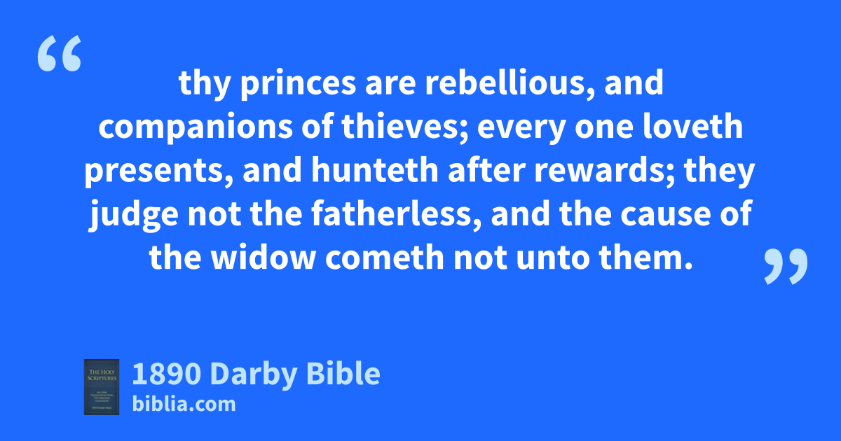 21 How is the faithful city become a harlot! It was full of judgment; righteousness used to lodge in it, but now murderers. 22 Thy silver is become dross, thy wine is mixed with water: 23 thy princes are rebellious, and companions of thieves; every one loveth presents, and hunteth after rewards; they judge not the fatherless, and the cause of the widow cometh not unto them. 24 Therefore saith the Lord, Jehovah of hosts, the Mighty One of Israel: Ah! I will ease me of mine adversaries, and avenge me of mine enemies. 25 And I will turn my hand upon thee, and will thoroughly purge away thy dross, and take away all thine alloy; 26 and I will restore thy judges as at the first, and thy counsellors as at the beginning. Afterwards thou shalt be called, Town of righteousness, Faithful city. 27 Zion shall be redeemed with judgment, and they that return of her with righteousness. 28 But the ruin of the transgressors and of the sinners shall be together; and they that forsake Jehovah shall be consumed. 29 For they shall be ashamed of the terebinths that ye have desired, and ye shall blush for the gardens that ye have chosen. 30 For ye shall be as a terebinth whose leaf fadeth, and as a garden that hath no water. 31 And the strong shall be for tow, and his work a spark; and they shall both burn together, and there shall be none to quench them.