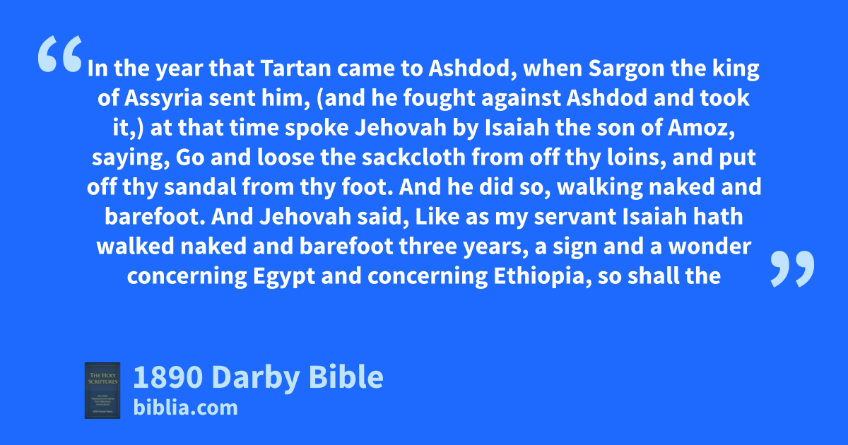 1 In the year that Tartan came to Ashdod, when Sargon the king of Assyria sent him, (and he fought against Ashdod and took it,) 2 at that time spoke Jehovah by Isaiah the son of Amoz, saying, Go and loose the sackcloth from off thy loins, and put off thy sandal from thy foot. And he did so, walking naked and barefoot. 3 And Jehovah said, Like as my servant Isaiah hath walked naked and barefoot three years, a sign and a wonder concerning Egypt and concerning Ethiopia, 4 so shall the king of Assyria lead away the captives of Egypt and the exiles of Ethiopia, young and old, naked and barefoot, and with buttocks uncovered, to the shame of Egypt. 5 And they shall be terrified and ashamed of Ethiopia their confidence, and of Egypt their boast. 6 And the inhabitants of this coast shall say in that day, Behold, such is our confidence, whither we fled for help to be delivered from the king of Assyria; and how shall we escape?