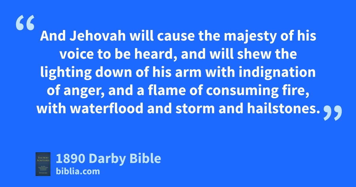 27 Behold, the name of Jehovah cometh from far, burning with his anger—a grievous conflagration; his lips are full of indignation, and his tongue as a consuming fire; 28 and his breath as an overflowing torrent, which reacheth even to the neck, to sift the nations with the sieve of destruction, and to put a bridle into the jaws of the peoples, that causeth them to go astray. 29 Ye shall have a song, as in the night when a feast is sanctified; and joy of heart, as of one who goeth with a pipe to come unto the mountain of Jehovah, to the Rock of Israel. 30 And Jehovah will cause the majesty of his voice to be heard, and will shew the lighting down of his arm with indignation of anger, and a flame of consuming fire, with waterflood and storm and hailstones. 31 For through the voice of Jehovah shall the Assyrian be broken down: he will smite him with the rod. 32 And wherever shall pass the appointed staff, which Jehovah shall lay upon him, it shall be with tambours and harps; and with tumultuous battles will he fight with it. 33 For Topheth is prepared of old; for the king also it is prepared: he hath made it deep and large; its pile is fire and much wood; the breath of Jehovah, like a stream of brimstone, doth kindle it.