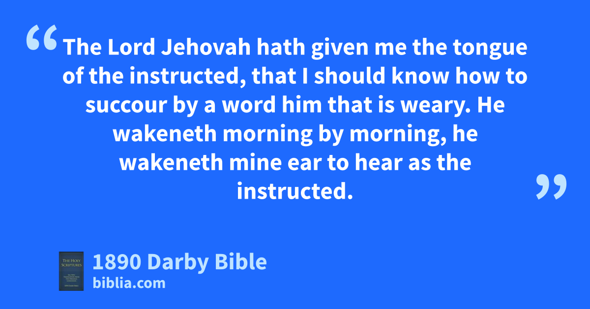 4 The Lord Jehovah hath given me the tongue of the instructed, that I should know how to succour by a word him that is weary. He wakeneth morning by morning, he wakeneth mine ear to hear as the instructed. 5 The Lord Jehovah hath opened mine ear, and I was not rebellious; I turned not away back. 6 I gave my back to smiters, and my cheeks to them that plucked off the hair; I hid not my face from shame and spitting. 7 But the Lord Jehovah will help me: therefore shall I not be confounded; therefore have I set my face like a flint, and I know that I shall not be ashamed. 8 He is near that justifieth me: who will contend with me? let us stand together; who is mine adverse party? let him draw near unto me. 9 Behold, the Lord Jehovah will help me; who is he that shall condemn me? Behold, they all shall grow old as a garment; the moth shall eat them up.