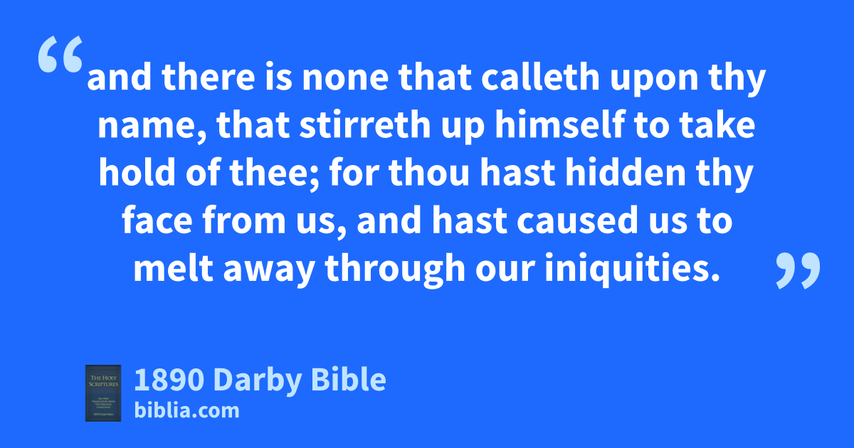 6 And we are all become as an unclean thing, and all our righteousnesses are as filthy rags; and we all fade as a leaf, and our iniquities, like the wind, have carried us away; 7 and there is none that calleth upon thy name, that stirreth up himself to take hold of thee; for thou hast hidden thy face from us, and hast caused us to melt away through our iniquities. 8 And now, Jehovah, thou art our Father; we are the clay, and thou our potter; and we all are the work of thy hand. 9 Be not wroth very sore, O Jehovah, neither remember iniquity for ever. Behold, see, we beseech thee, we are all thy people. 10 Thy holy cities are become a wilderness, Zion is a wilderness, Jerusalem a desolation. 11 Our holy and our beautiful house, where our fathers praised thee, is burnt up with fire, and all our precious things are laid waste. 12 Wilt thou restrain thyself in presence of these things, Jehovah? Wilt thou hold thy peace, and afflict us very sore?