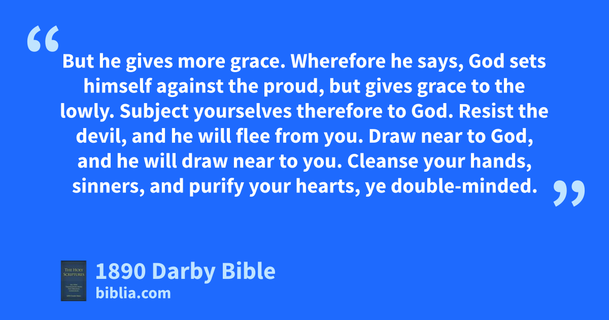 1 Whence come wars and whence fightings among you? Is it not thence, —from your pleasures, which war in your members? 2 Ye lust and have not: ye kill and are full of envy, and cannot obtain; ye fight and war; ye have not because ye ask not. 3 Ye ask and receive not, because ye ask evilly, that ye may consume it in your pleasures. 4 Adulteresses, know ye not that friendship with the world is enmity with God? Whoever therefore is minded to be the friend of the world is constituted enemy of God. 5 Think ye that the scripture speaks in vain? Does the Spirit which has taken his abode in us desire enviously? 6 But he gives more grace. Wherefore he says, God sets himself against the proud, but gives grace to the lowly. 7 Subject yourselves therefore to God. Resist the devil, and he will flee from you. 8 Draw near to God, and he will draw near to you. Cleanse your hands, sinners, and purify your hearts, ye double-minded. 9 Be wretched, and mourn, and weep: let your laughter be turned to mourning, and your joy to heaviness. 10 Humble yourselves before the Lord, and he shall exalt you.