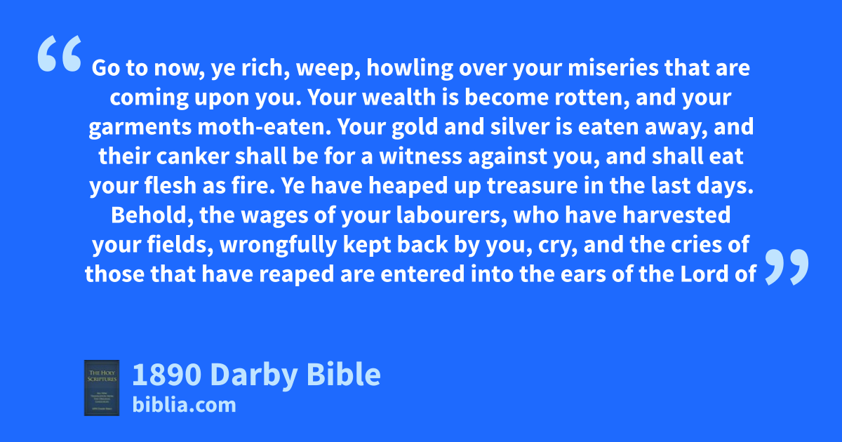 1 Go to now, ye rich, weep, howling over your miseries that are coming upon you. 2 Your wealth is become rotten, and your garments moth-eaten. 3 Your gold and silver is eaten away, and their canker shall be for a witness against you, and shall eat your flesh as fire. Ye have heaped up treasure in the last days. 4 Behold, the wages of your labourers, who have harvested your fields, wrongfully kept back by you, cry, and the cries of those that have reaped are entered into the ears of the Lord of sabaoth. 5 Ye have lived luxuriously on the earth and indulged yourselves; ye have nourished your hearts as in a day of slaughter; 6 ye have condemned, ye have killed the just; he does not resist you. 7 Have patience, therefore, brethren, till the coming of the Lord. Behold, the labourer awaits the precious fruit of the earth, having patience for it until it receive the early and the latter rain. 8 Ye also have patience: stablish your hearts, for the coming of the Lord is drawn nigh. 9 Complain not one against another, brethren, that ye be not judged. Behold, the judge stands before the door. 10 Take as an example, brethren, of suffering and having patience, the prophets, who have spoken in the name of the Lord. 11 Behold, we call them blessed who have endured. Ye have heard of the endurance of Job, and seen the end of the Lord; that the Lord is full of tender compassion and pitiful.