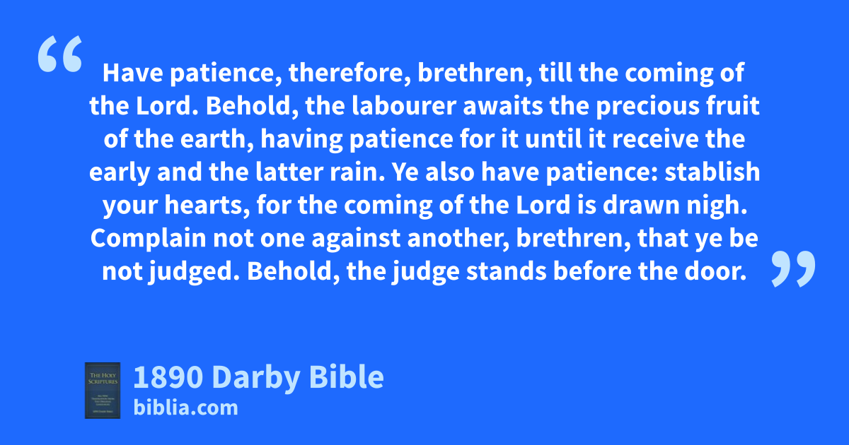 1 Go to now, ye rich, weep, howling over your miseries that are coming upon you. 2 Your wealth is become rotten, and your garments moth-eaten. 3 Your gold and silver is eaten away, and their canker shall be for a witness against you, and shall eat your flesh as fire. Ye have heaped up treasure in the last days. 4 Behold, the wages of your labourers, who have harvested your fields, wrongfully kept back by you, cry, and the cries of those that have reaped are entered into the ears of the Lord of sabaoth. 5 Ye have lived luxuriously on the earth and indulged yourselves; ye have nourished your hearts as in a day of slaughter; 6 ye have condemned, ye have killed the just; he does not resist you. 7 Have patience, therefore, brethren, till the coming of the Lord. Behold, the labourer awaits the precious fruit of the earth, having patience for it until it receive the early and the latter rain. 8 Ye also have patience: stablish your hearts, for the coming of the Lord is drawn nigh. 9 Complain not one against another, brethren, that ye be not judged. Behold, the judge stands before the door. 10 Take as an example, brethren, of suffering and having patience, the prophets, who have spoken in the name of the Lord. 11 Behold, we call them blessed who have endured. Ye have heard of the endurance of Job, and seen the end of the Lord; that the Lord is full of tender compassion and pitiful.