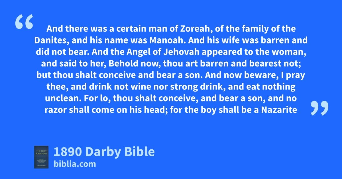 1 And the children of Israel again did evil in the sight of Jehovah; and Jehovah gave them into the hand of the Philistines forty years. 2 And there was a certain man of Zoreah, of the family of the Danites, and his name was Manoah. And his wife was barren and did not bear. 3 And the Angel of Jehovah appeared to the woman, and said to her, Behold now, thou art barren and bearest not; but thou shalt conceive and bear a son. 4 And now beware, I pray thee, and drink not wine nor strong drink, and eat nothing unclean. 5 For lo, thou shalt conceive, and bear a son, and no razor shall come on his head; for the boy shall be a Nazarite of God from the womb; and he shall begin to save Israel out of the hand of the Philistines. 6 And the woman came and told her husband, saying, A man of God came to me, and his appearance was like the appearance of an angel of God, very terrible; but I did not ask him whence he was, neither did he tell me his name. 7 And he said to me, Behold, thou shalt conceive and bear a son; and now drink not wine nor strong drink, and eat not anything unclean; for the boy shall be a Nazarite of God from the womb to the day of his death.