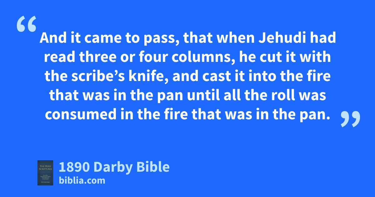 20 And they went in unto the king into the court, but they laid up the roll in the chamber of Elishama the scribe; and they told all the words in the ears of the king. 21 And the king sent Jehudi to fetch the roll, and he fetched it out of the chamber of Elishama the scribe. And Jehudi read it in the ears of the king, and in the ears of all the princes that stood beside the king. 22 Now the king was sitting in the winter-house in the ninth month, and with the fire-pan burning before him. 23 And it came to pass, that when Jehudi had read three or four columns, he cut it with the scribe’s knife, and cast it into the fire that was in the pan until all the roll was consumed in the fire that was in the pan. 24 And they were not afraid, nor rent their garments, neither the king nor any of his servants that heard all these words. 25 Moreover, Elnathan and Delaiah and Gemariah had made intercession to the king that he would not burn the roll; but he would not hear them. 26 And the king commanded Jerahmeel the son of Hammelech, and Seraiah the son of Azriel, and Shelemiah the son of Abdeel, to take Baruch the scribe and Jeremiah the prophet; but Jehovah hid them. 27 And after that the king had burned the roll, and the words that Baruch wrote at the mouth of Jeremiah, the word of Jehovah came to Jeremiah, saying, 28 Take thee again another roll, and write in it all the former words that were in the first roll which Jehoiakim the king of Judah hath burned. 29 And thou shalt say to Jehoiakim king of Judah, Thus saith Jehovah: Thou hast burned this roll, saying, Why hast thou written therein, saying, The king of Babylon shall certainly come and destroy this land, and shall cause to cease from it man and beast? 30 Therefore thus saith Jehovah concerning Jehoiakim king of Judah: He shall have none to sit upon the throne of David; and his dead body shall be cast out in the day to the heat, and in the night to the frost. 31 And I will visit their iniquity upon him, and upon his seed, and upon his servants; and I will bring upon them, and upon the inhabitants of Jerusalem, and upon the men of Judah, all the evil that I have pronounced against them; and they have not hearkened. 32 And Jeremiah took another roll, and gave it to Baruch the scribe, the son of Nerijah; and he wrote therein from the mouth of Jeremiah, all the words of the book that Jehoiakim king of Judah had burned in the fire; and there were added besides unto them many like words.