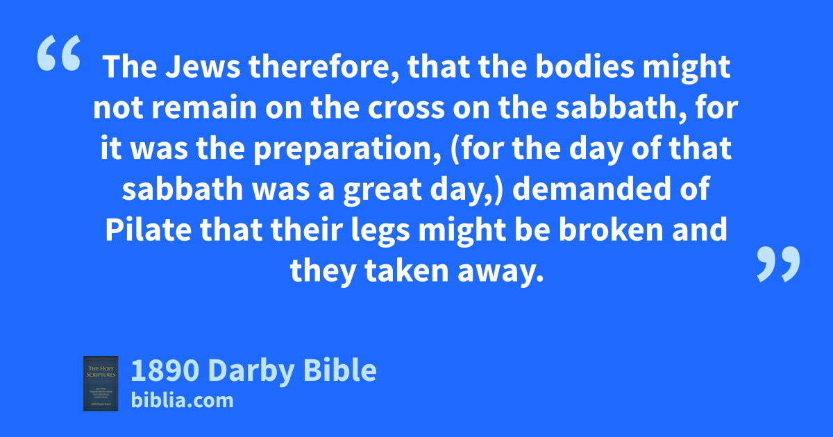 31 The Jews therefore, that the bodies might not remain on the cross on the sabbath, for it was the preparation, (for the day of that sabbath was a great day,) demanded of Pilate that their legs might be broken and they taken away. 32 The soldiers therefore came and broke the legs of the first and of the other that had been crucified with him; 33 but coming to Jesus, when they saw that he was already dead they did not break his legs, 34 but one of the soldiers pierced his side with a spear, and immediately there came out blood and water. 35 And he who saw it bears witness, and his witness is true, and he knows that he says true that ye also may believe. 36 For these things took place that the scripture might be fulfilled, Not a bone of him shall be broken. 37 And again another scripture says, They shall look on him whom they pierced.