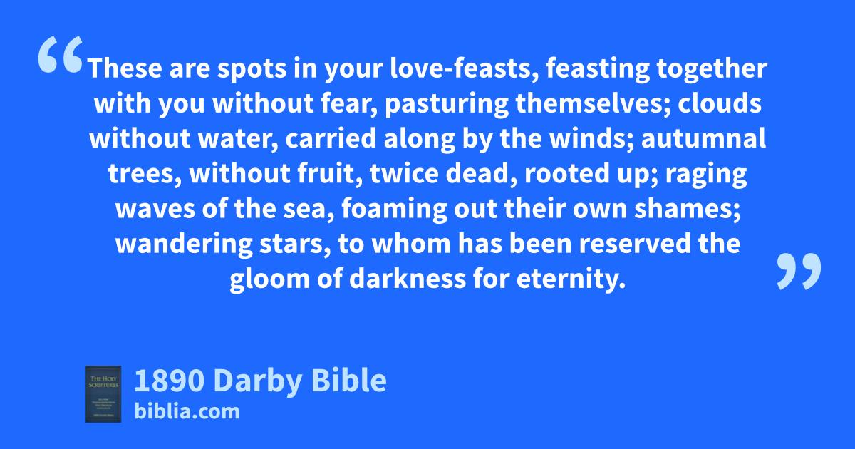 8 Yet in like manner these dreamers also defile the flesh, and despise lordship, and speak railingly against dignities. 9 But Michael the archangel, when disputing with the devil he reasoned about the body of Moses, did not dare to bring a railing judgment against him, but said, The Lord rebuke thee. 10 But these, whatever things they know not, they speak railingly against; but what even, as the irrational animals, they understand by mere nature, in these things they corrupt themselves. 11 Woe to them! because they have gone in the way of Cain, and given themselves up to the error of Balaam for reward, and perished in the gainsaying of Core. 12 These are spots in your love-feasts, feasting together with you without fear, pasturing themselves; clouds without water, carried along by the winds; autumnal trees, without fruit, twice dead, rooted up; 13 raging waves of the sea, foaming out their own shames; wandering stars, to whom has been reserved the gloom of darkness for eternity. 14 And Enoch, the seventh from Adam, prophesied also as to these, saying, Behold, the Lord has come amidst his holy myriads,