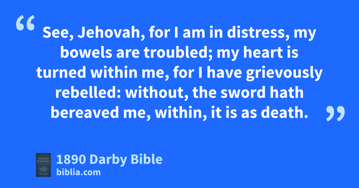 12 Is it nothing to you, all ye that pass by? Behold, and see if there be any sorrow like unto my sorrow, which is done unto me, whom Jehovah hath afflicted in the day of his fierce anger. 13 From on high hath he sent fire into my bones, and it prevaileth against them; he hath spread a net for my feet; he hath turned me back; he hath made me desolate and faint all the day. 14 The yoke of my transgressions is bound by his hand: they are wreathed, they are come up upon my neck; he hath made my strength to fail; the Lord hath delivered me into hands out of which I am not able to rise up. 15 The Lord hath cast down all my mighty men in the midst of me; he hath called an assembly against me to crush my young men; the Lord hath trodden as a winepress the virgin daughter of Judah. 16 For these things I weep; mine eye, mine eye runneth down with water: for the comforter that should revive my soul is far from me; my children are desolate, for the enemy hath prevailed. 17 Zion spreadeth forth her hands; there is none to comfort her; Jehovah hath commanded concerning Jacob, that his adversaries should be round about him; Jerusalem is as an impurity among them. 18 Jehovah is righteous; for I have rebelled against his commandment. Hear, I pray you, all ye peoples, and behold my sorrow. My virgins and my young men are gone into captivity. 19 I called for my lovers, they have deceived me; my priests and mine elders have expired in the city, while they sought them food to revive their soul. 20 See, Jehovah, for I am in distress, my bowels are troubled; my heart is turned within me, for I have grievously rebelled: without, the sword hath bereaved me, within, it is as death. 21 They have heard that I sigh: I have no comforter: all mine enemies have heard of my calamity; they are glad that thou hast done it. Thou wilt bring the day that thou hast called, and they shall be like unto me. 22 Let all their wickedness come before thee; and do unto them, as thou hast done unto me for all my transgressions: for my sighs are many, and my heart is faint.