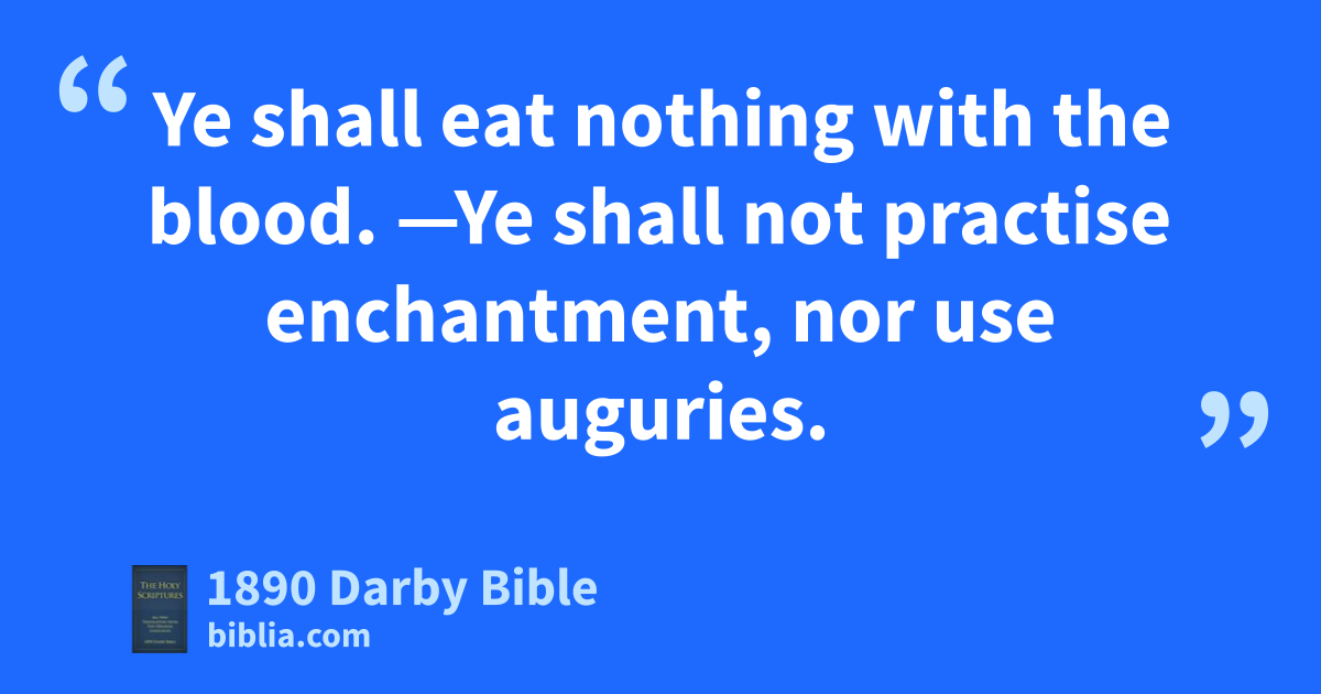 19 My statutes shall ye observe. Thou shalt not let thy cattle gender with another sort; thou shalt not sow thy field with seed of two sorts; and a garment woven of two materials shall not come upon thee. 20 And if a man lie with a woman for copulation, and she is a bondwoman betrothed to a husband, but not at all ransomed, nor hath freedom been given to her, there shall be a chastisement: they shall not be put to death, for she was not free. 21 And he shall bring his trespass-offering to Jehovah, unto the entrance of the tent of meeting, a ram for a trespass-offering. 22 And the priest shall make atonement for him with the ram of the trespass-offering before Jehovah for his sin which he hath done; and the sin which he hath done shall be forgiven him. 23 And when ye come into the land and plant all manner of trees for food, then ye shall count its fruit as uncircumcised, three years shall it be uncircumcised unto you: it shall not be eaten of; 24 and in the fourth year all the fruit thereof shall be holy for praise to Jehovah; 25 and in the fifth year shall ye eat the fruit thereof, that it may increase unto you the produce thereof: I am Jehovah your God. 26 Ye shall eat nothing with the blood. —Ye shall not practise enchantment, nor use auguries. 27 —Ye shall not shave the corners of your head round, neither shalt thou mutilate the corners of thy beard. 28 And cuttings for a dead person shall ye not make in your flesh, nor put any tattoo writing upon you: I am Jehovah. 29 —Do not profane thy daughter, to give her up to whoredom; lest the land practise whoredom, and the land become full of infamy.