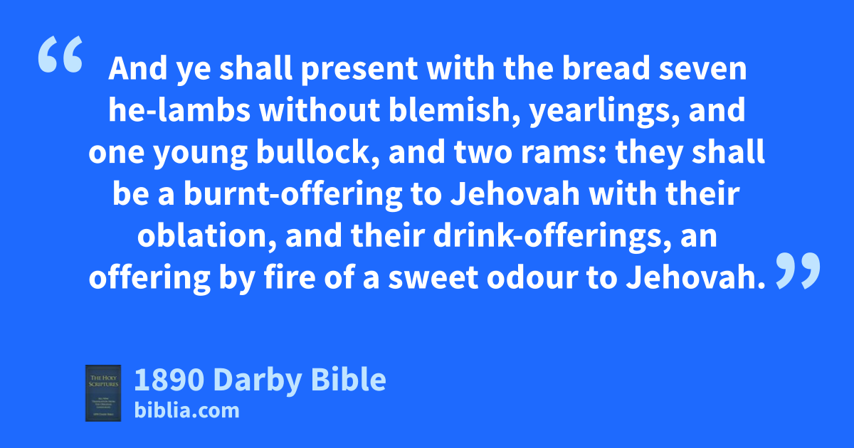 4 These are the set feasts of Jehovah, holy convocations, which ye shall proclaim in their seasons: 5 In the first month, on the fourteenth of the month, between the two evenings, is the passover to Jehovah. 6 And on the fifteenth day of this month is the feast of unleavened bread to Jehovah; seven days shall ye eat unleavened bread. 7 On the first day ye shall have a holy convocation: no manner of servile work shall ye do. 8 And ye shall present to Jehovah an offering by fire seven days; on the seventh day is a holy convocation: no manner of servile work shall ye do. 9 And Jehovah spoke to Moses, saying, 10 Speak unto the children of Israel and say unto them, When ye come into the land that I give unto you, and ye reap the harvest thereof, then ye shall bring a sheaf of the first-fruits of your harvest unto the priest. 11 And he shall wave the sheaf before Jehovah, to be accepted for you; on the next day after the sabbath the priest shall wave it. 12 And ye shall offer that day when ye wave the sheaf, a he-lamb without blemish, a yearling, for a burnt-offering to Jehovah; 13 and the oblation thereof: two tenths of fine flour mingled with oil, an offering by fire to Jehovah for a sweet odour; and the drink-offering thereof, of wine, a fourth part of a hin. 14 And ye shall not eat bread, or roast corn, or green ears, until the same day that ye have brought the offering of your God: it is an everlasting statute throughout your generations in all your dwellings.