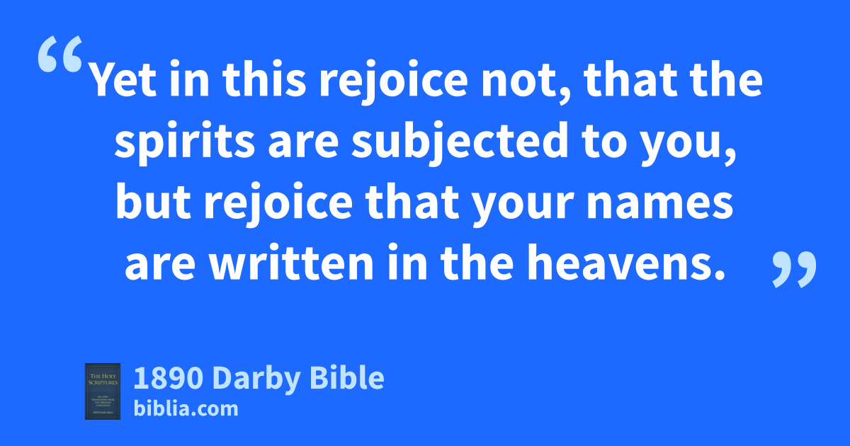 17 And the seventy returned with joy, saying, Lord, even the demons are subject to us through thy name. 18 And he said to them, I beheld Satan as lightning falling out of heaven. 19 Behold, I give you the power of treading upon serpents and scorpions and over all the power of the enemy, and nothing shall in anywise injure you. 20 Yet in this rejoice not, that the spirits are subjected to you, but rejoice that your names are written in the heavens. 21 In the same hour Jesus rejoiced in spirit and said, I praise thee, Father, Lord of the heaven and of the earth, that thou hast hid these things from wise and prudent, and hast revealed them to babes: yea, Father, for thus has it been well-pleasing in thy sight. 22 All things have been delivered to me by my Father, and no one knows who the Son is but the Father, and who the Father is but the Son, and he to whomsoever the Son is pleased to reveal him. 23 And having turned to the disciples privately he said, Blessed are the eyes which see the things that ye see. 24 For I say to you that many prophets and kings have desired to see the things which ye behold, and did not see them; and to hear the things which ye hear, and did not hear them.