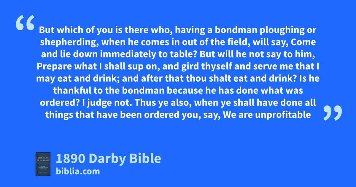 1 And he said to his disciples, It cannot be but that offences come, but woe to him by whom they come! 2 It would be more profitable for him if a millstone were hanged about his neck and he cast into the sea, than that he should be a snare to one of these little ones. 3 Take heed to yourselves: if thy brother should sin, rebuke him; and if he should repent, forgive him. 4 And if he should sin against thee seven times in the day, and seven times should return to thee, saying, I repent, thou shalt forgive him. 5 And the apostles said to the Lord, Give more faith to us. 6 But the Lord said, If ye have faith as a grain of mustard seed, ye had said to this sycamine tree, Be thou rooted up, and be thou planted in the sea, and it would have obeyed you. 7 But which of you is there who, having a bondman ploughing or shepherding, when he comes in out of the field, will say, Come and lie down immediately to table? 8 But will he not say to him, Prepare what I shall sup on, and gird thyself and serve me that I may eat and drink; and after that thou shalt eat and drink? 9 Is he thankful to the bondman because he has done what was ordered? I judge not. 10 Thus ye also, when ye shall have done all things that have been ordered you, say, We are unprofitable bondmen; we have done what it was our duty to do.