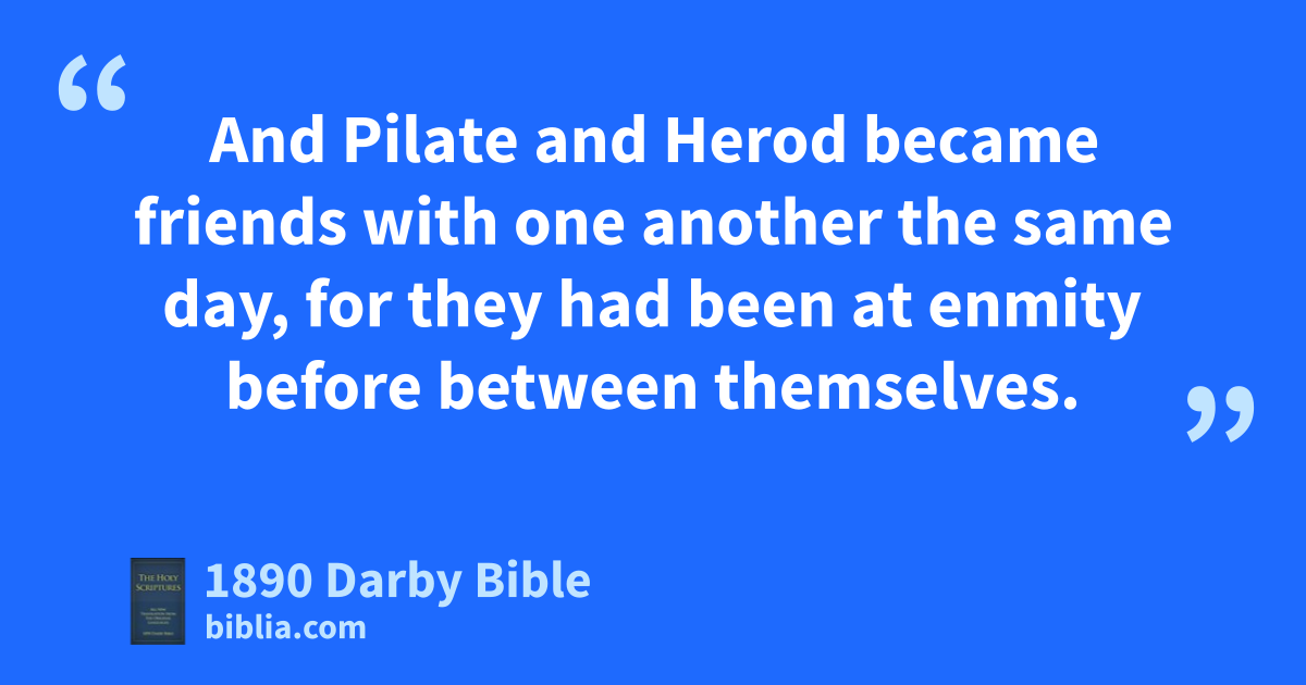 1 And the whole multitude of them, rising up, led him to Pilate. 2 And they began to accuse him, saying, We have found this man perverting our nation, and forbidding to give tribute to Caesar, saying that he himself is Christ, a king. 3 And Pilate demanded of him saying, Art thou the king of the Jews? And he answering him said, Thou sayest. 4 And Pilate said to the chief priests and the crowds, I find no guilt in this man. 5 But they insisted, saying, He stirs up the people, teaching throughout all Judaea, beginning from Galilee even on to here. 6 But Pilate, having heard Galilee named, demanded if the man were a Galilaean; 7 and having learned that he was of Herod’s jurisdiction, remitted him to Herod, who himself also was at Jerusalem in those days. 8 And when Herod saw Jesus he greatly rejoiced, for he had been a long while desirous of seeing him, because of hearing many things concerning him, and he hoped to see some sign done by him; 9 and he questioned him in many words, but he answered him nothing. 10 And the chief priests and the scribes stood and accused him violently. 11 And Herod with his troops having set him at nought and mocked him, having put a splendid robe upon him, sent him back to Pilate. 12 And Pilate and Herod became friends with one another the same day, for they had been at enmity before between themselves.