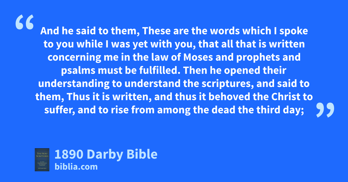 13 And behold, two of them were going on the same day to a village distant sixty stadia from Jerusalem, called Emmaus; 14 and they conversed with one another about all these things which had taken place. 15 And it came to pass as they conversed and reasoned, that Jesus himself drawing nigh, went with them; 16 but their eyes were holden so as not to know him. 17 And he said to them, What discourses are these which pass between you as ye walk, and are downcast? 18 And one of them, named Cleopas, answering said to him, Thou sojournest alone in Jerusalem, and dost not know what has taken place in it in these days? 19 And he said to them, What things? And they said to him, The things concerning Jesus the Nazaraean, who was a prophet mighty in deed and word before God and all the people; 20 and how the chief priests and our rulers delivered him up to the judgment of death and crucified him. 21 But we had hoped that he was the one who is about to redeem Israel. But then, besides all these things, it is now, to-day, the third day since these things took place. 22 And withal, certain women from amongst us astonished us, having been very early at the sepulchre, 23 and, not having found his body, came, saying that they also had seen a vision of angels, who say that he is living. 24 And some of those with us went to the sepulchre, and found it so, as the women also had said, but him they saw not. 25 And he said to them, O senseless and slow of heart to believe in all that the prophets have spoken! 26 Ought not the Christ to have suffered these things and to enter into his glory? 27 And having begun from Moses and from all the prophets, he interpreted to them in all the scriptures the things concerning himself. 28 And they drew near to the village where they were going, and he made as though he would go farther. 29 And they constrained him, saying, Stay with us, for it is toward evening and the day is declining. And he entered in to stay with them. 30 And it came to pass as he was at table with them, having taken the bread, he blessed, and having broken it, gave it to them. 31 And their eyes were opened, and they recognised him. And he disappeared from them. 32 And they said to one another, Was not our heart burning in us as he spoke to us on the way, and as he opened the scriptures to us? 33 And rising up the same hour, they returned to Jerusalem. And they found the eleven, and those with them, gathered together, 34 saying, The Lord is indeed risen and has appeared to Simon. 35 And they related what had happened on the way, and how he was made known to them in the breaking of bread.
